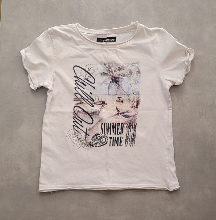 T-shirt manches courtes, de couleur blanc avec motif, de la marque In Extenso, taille 4 ans, en très bon état. Article lavé pour la vente.