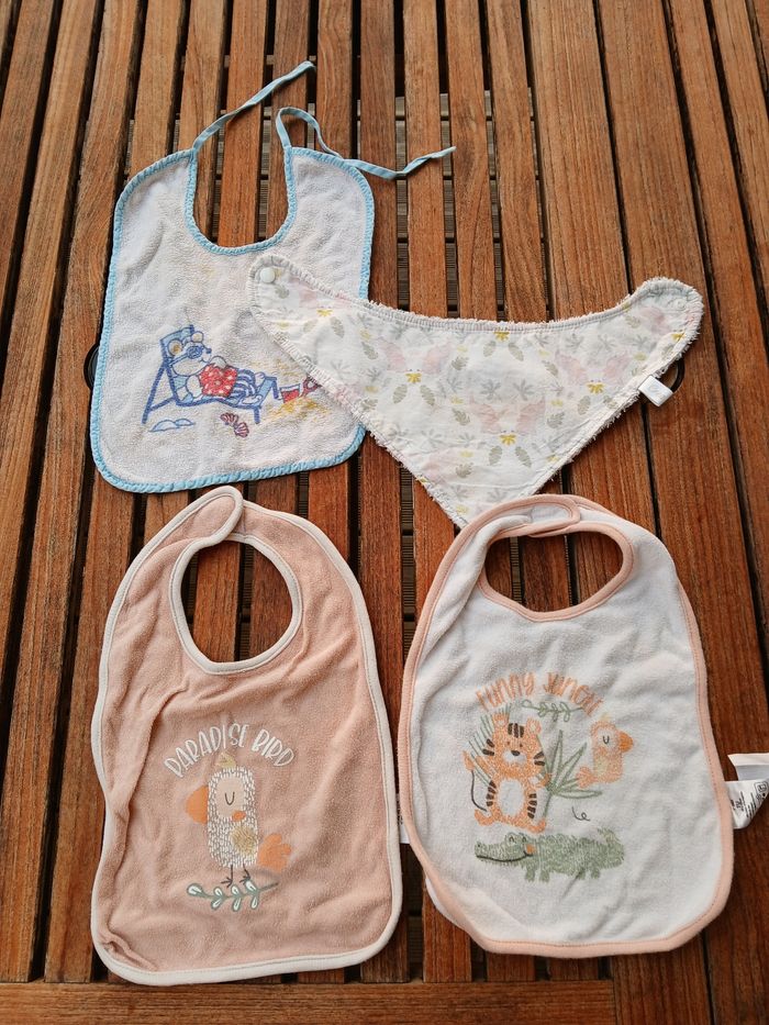 Ensemble de 4 bavoirs bébé : - 1 bavoir bandana, motifs roses, jaunes et verts, quis'attache avec un bouton pression - 1 bavoir bordures bleus avec un dessin d'un ours dans un transat, s'attache avec un noeud - 2 bavoirs (un blanc, un orange) qui s'attachent avec un scratch / velcro Ils sont tachés mais peuvent encore servir !