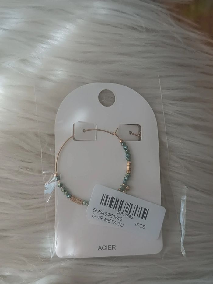Boucles d'oreilles bleu vert et dorées en acier inoxydable Bohm Neuf dans son emballage d'origine - photo numéro 2