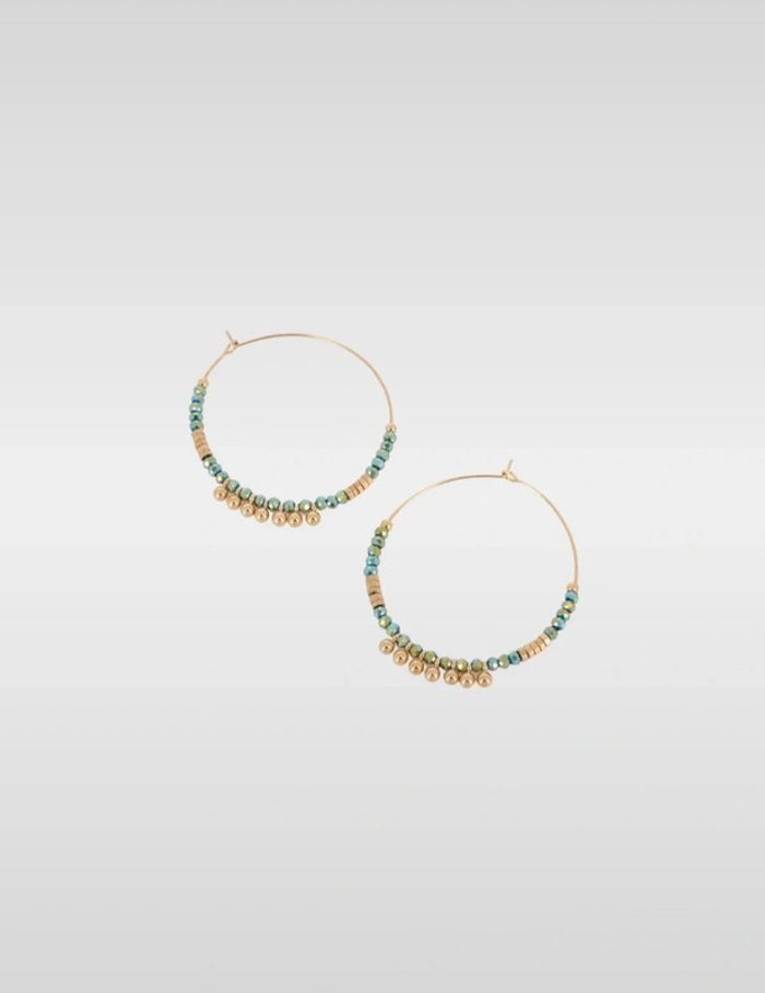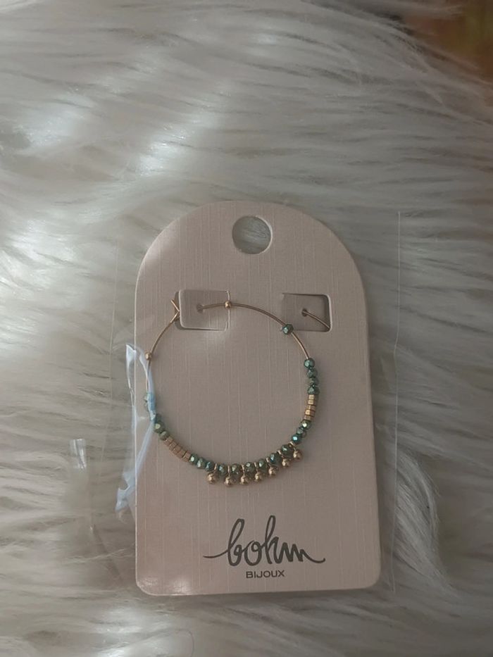 Boucles d'oreilles bleu vert et dorées en acier inoxydable Bohm Neuf dans son emballage d'origine - photo numéro 1