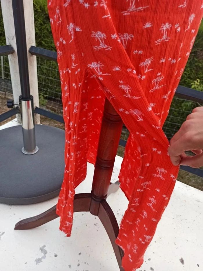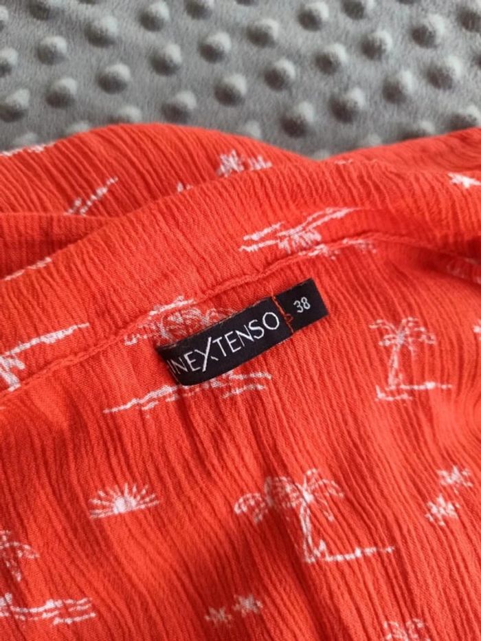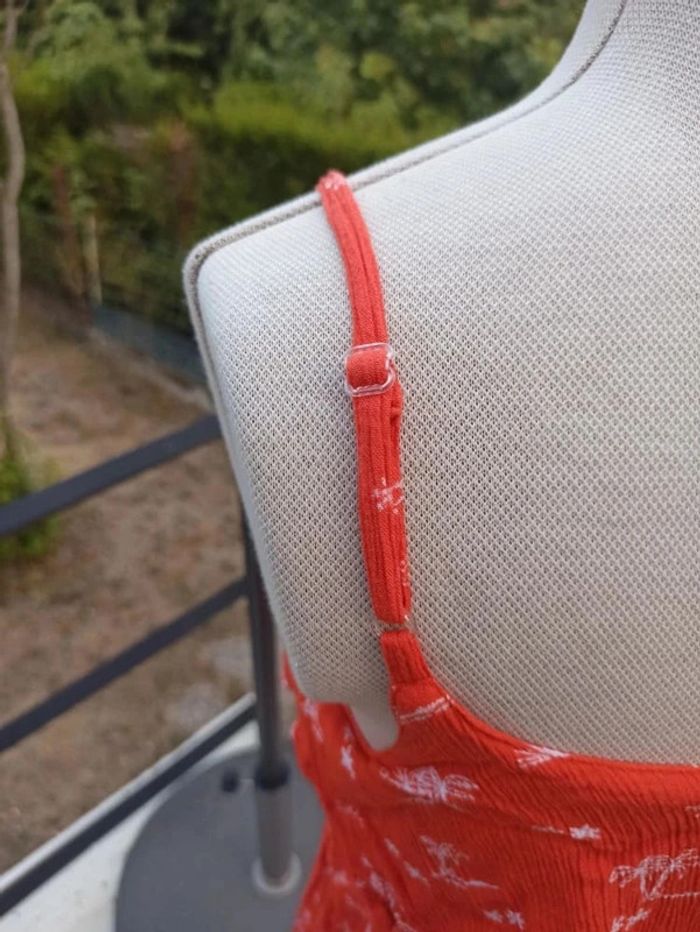 Robe orange imprimée parlmiers blancs In Extenso taille 38. Bretelles réglables, fendue des 2 côtés. En très bon état