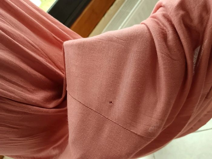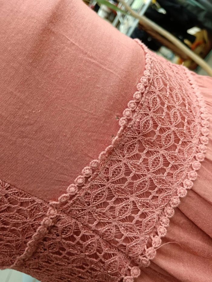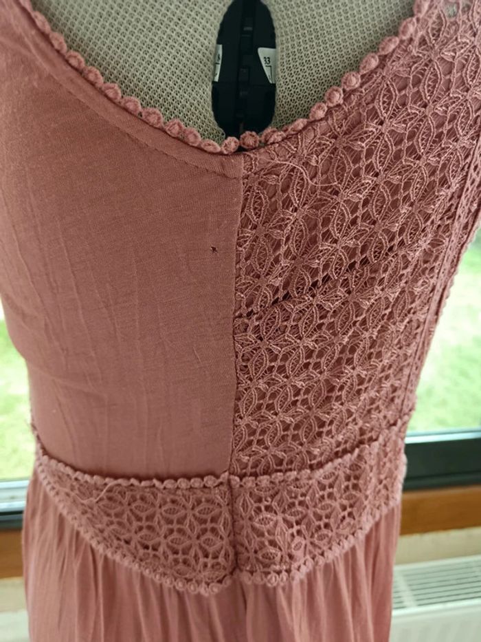 Robe maxi vieux rose H&M taille 36. Broderie anglaise sur le buste. Longueur totale 156cm. Malheureusement il y a des accrocs dans le tissu à plusieurs endroits (voir photos) principalement en bas de la robe et au niveau de la ceinture. Je la vends à petit prix pour une personne qui saura la réparer, j'avais pensé à la raccourcir et à ajouter des petits broderie mais je n'ai pas le temps de m'en occuper !