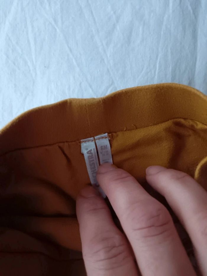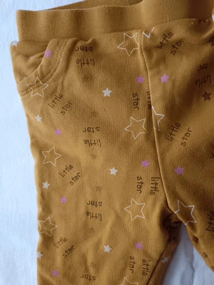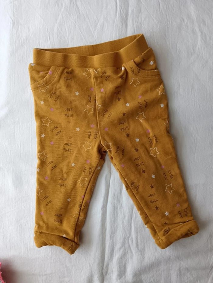 Pantalon Orchestra taille 6 mois. Couleur jaune moutarde imprimé étoiles, taille élastique. Double épaisseur de tissus donc assez chaud. En très bon état.