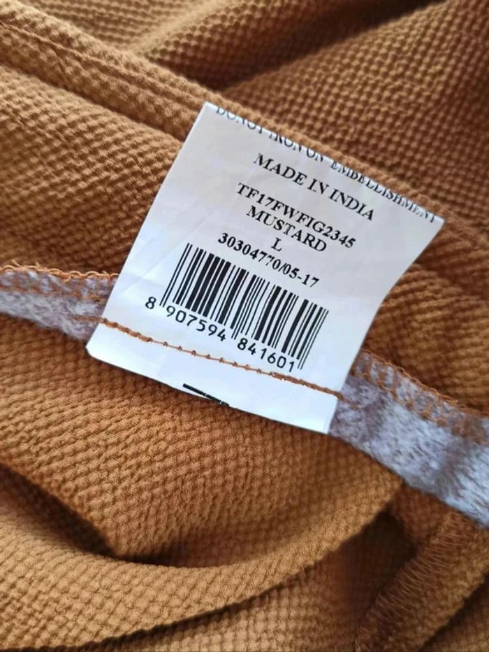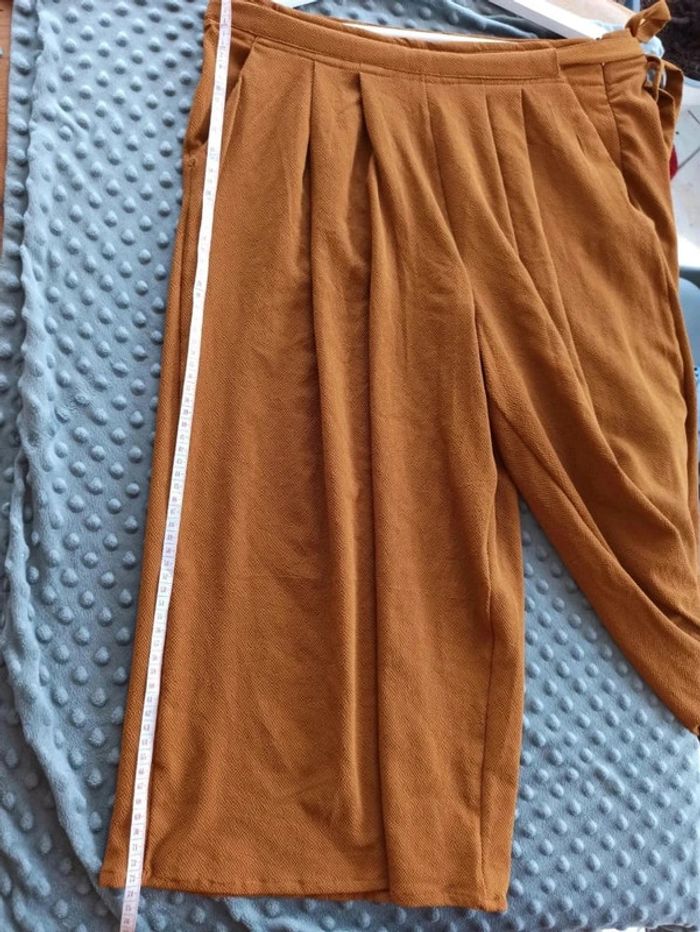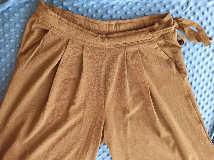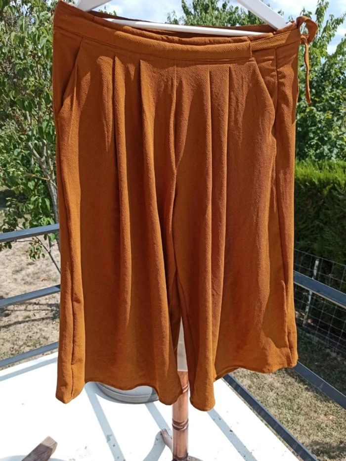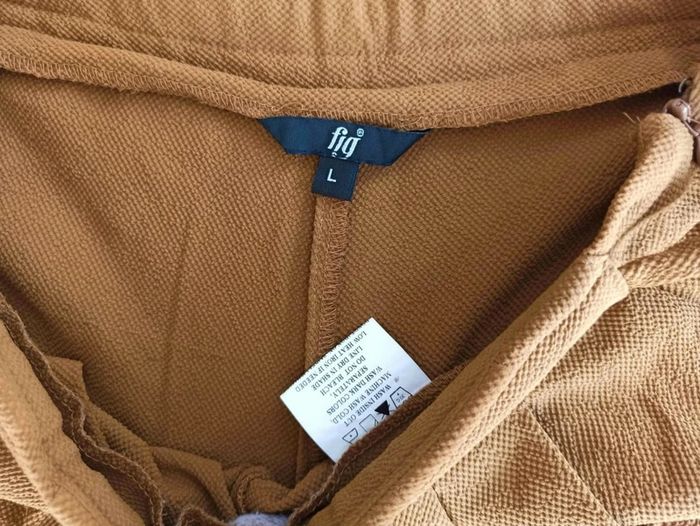 Pantacourt jupe-culotte, tissu gauffré couleur camel, Fig taille L. Taille élastique + lien de serrage. Fermeture latérale invisible. Fig, marque éco-responsable canadienne 🇨🇦 En parfait état.