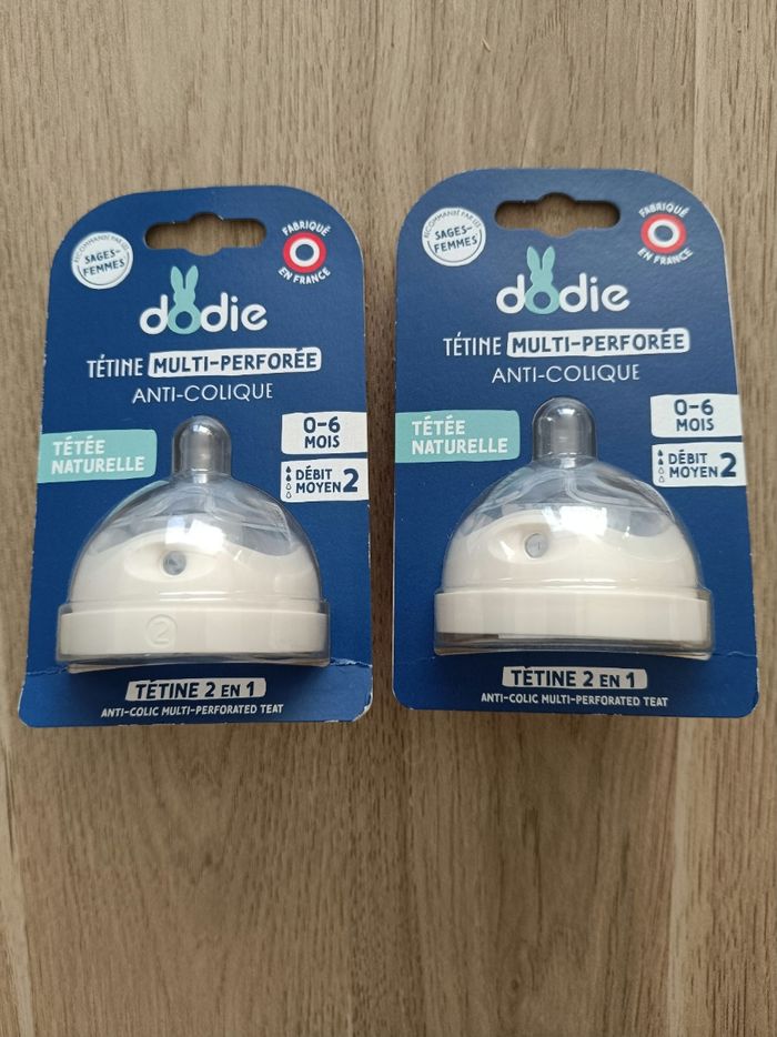Je vends ces biberons Dodie avec leurs tétines anti-colique multi-perforées pour bébé de 0 à 6 mois. - Type de produit : Biberons en plastique - Marque : Dodie - Accessoires inclus : Tétines anti-colique multi-perforées - Débit 1 (x2) - Debit 2 (x2 Neufs) - Débit 3 (x2 ouverts car livrés avec les biberons mais jamais utilisés Neufs) - Âge : 0-6 mois Ils n'ont pratiquement pas été utilisé car mon bébé n'aimait pas la forme de la tétine.