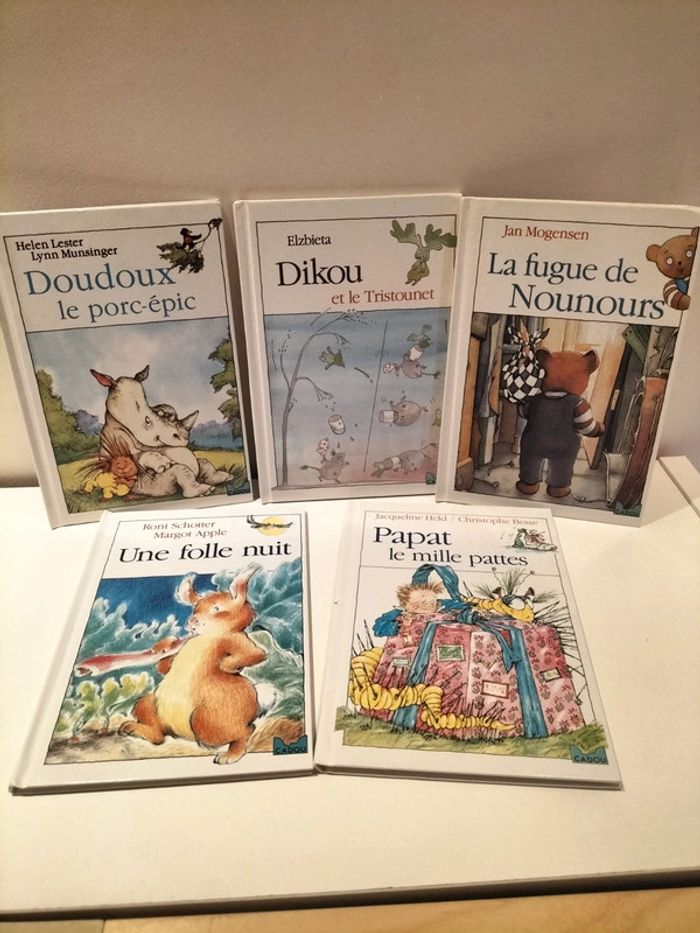 Lot de 5 petits livres, aux éditions Hachette, dans la série Cadou, Pour enfant à partir de 3,4 ans, 5 livres joliment illustrés, Vous découvrirez les histoires, de doudou le porc-épic, de patat le mille-pattes, de la folle nuit de l'écureuil, de la fugue de nounours, et de Dikou le petit troum... 5 Livres en très bon état, seul l'un d'entre eux a un petit accroc sur la couverture voir photos. (Attention le numéro ISBN reconnu par vinted n'a pas le bon titre.)