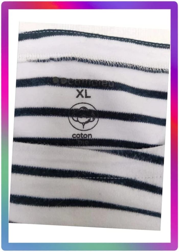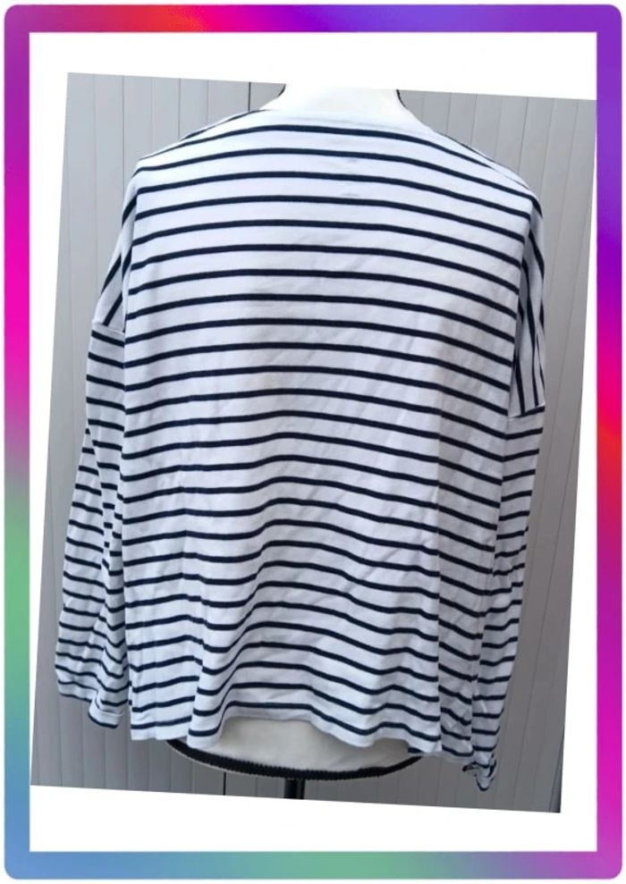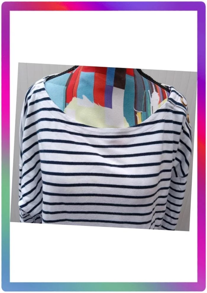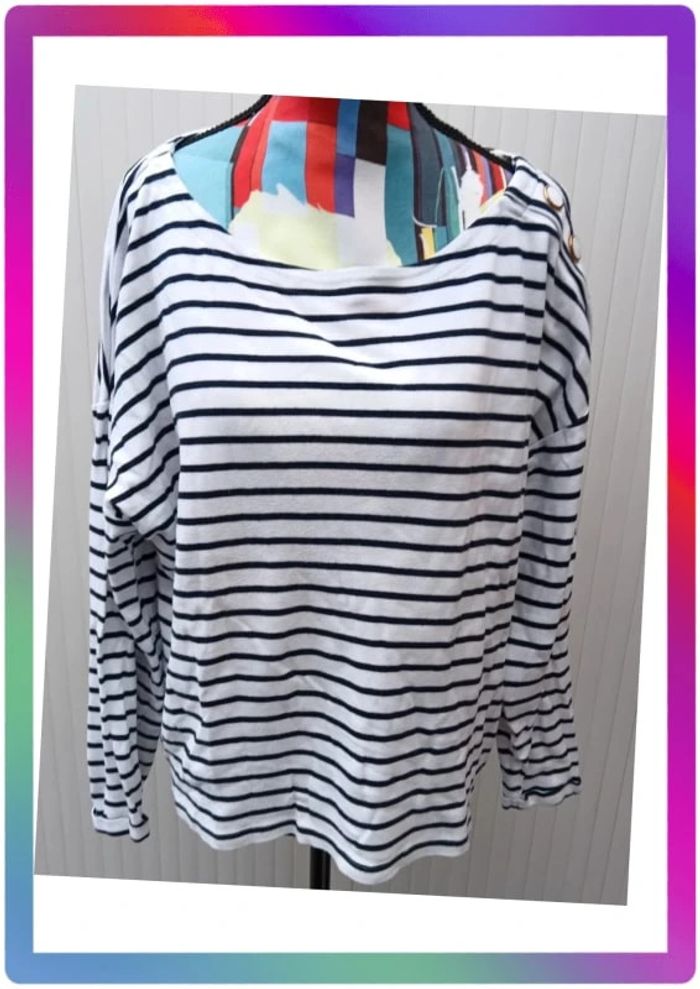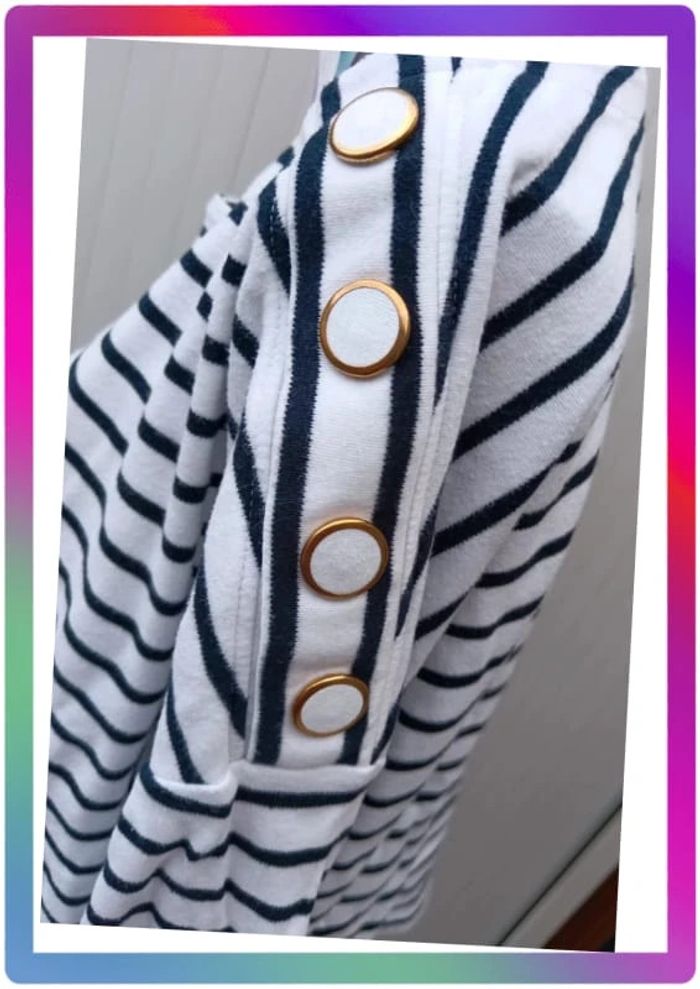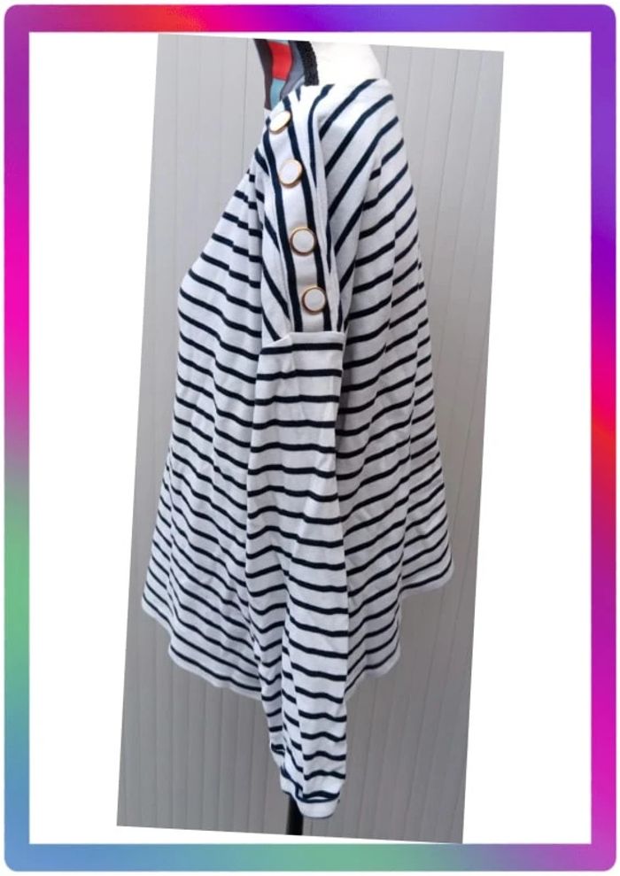 A rayures, col rond, bouton décoratif à l'épaule. Bon état général. Aisselles à aisselles 62 cm #pitou83710femmeXL N' hésitez pas à choisir votre point relais pour les frais de port !