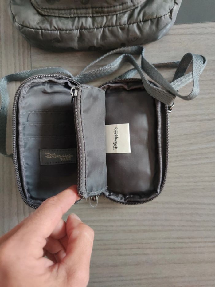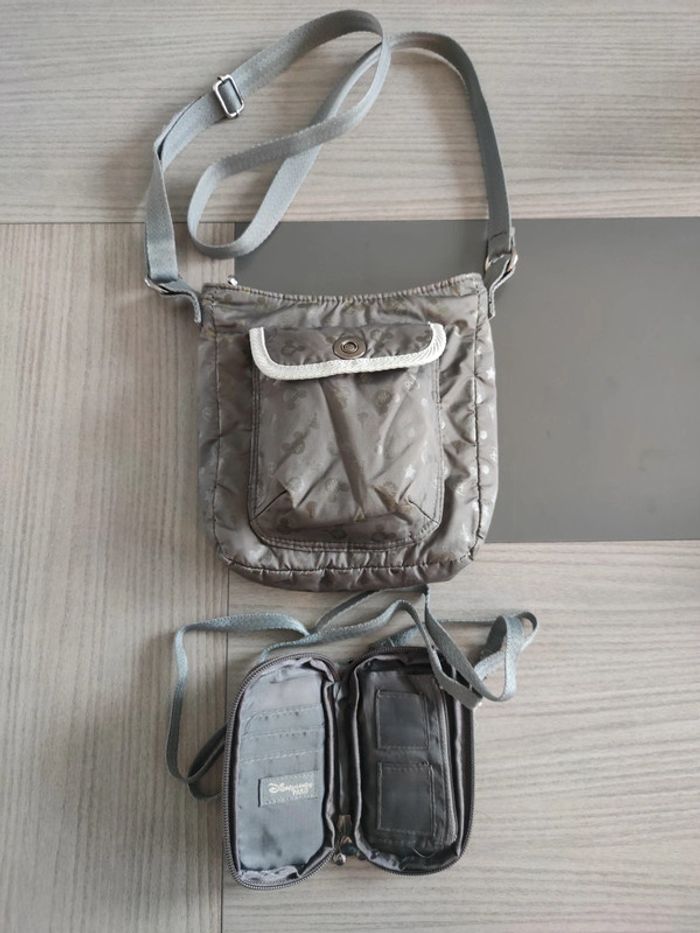 Sacoche bandoulière avec sa mini sacoche porte monnaie et range cartes avec bandoulière également. Tissu imperméable. Très bon état. Achetés à Disneyland Paris