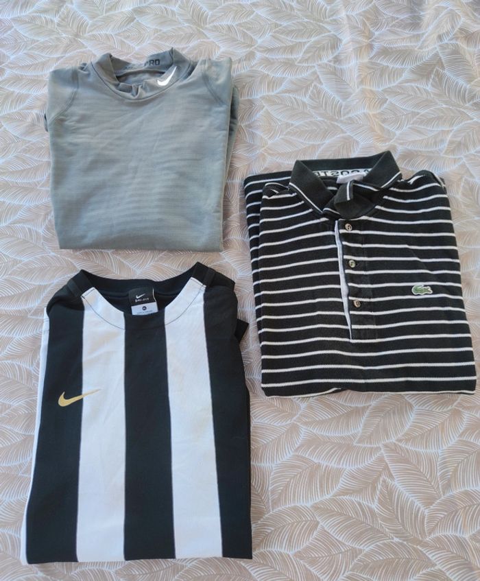 Un polo Lacoste, un maillot foot Nike manches longues et un t-shirt foot Nike .