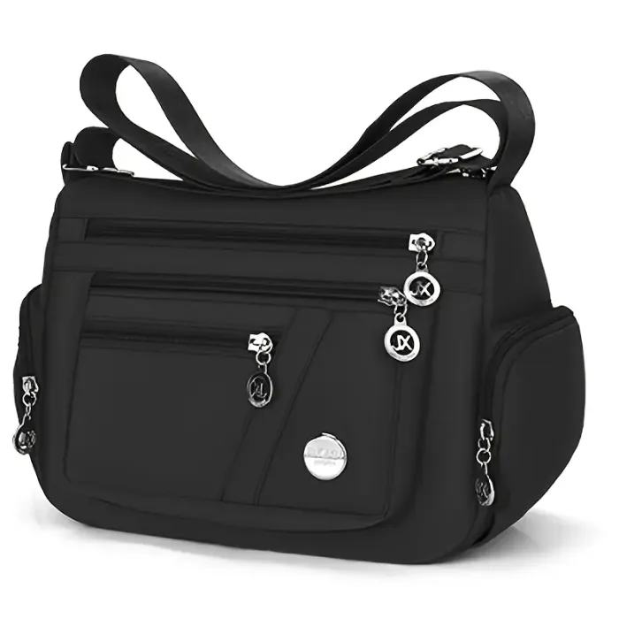 sac noir matelassé avec bandoulière réglable, compartiments multiples avec fermetures éclair , breloques décoratives Doublure en polyester Etat neuf