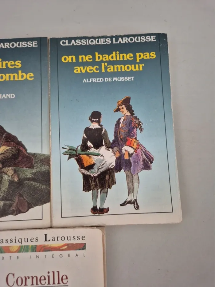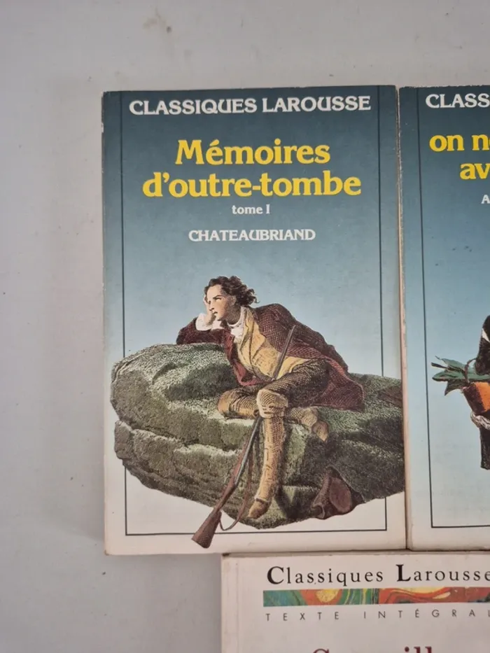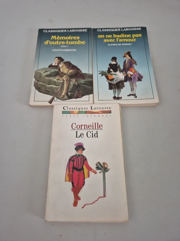 Lot de 3 livres Mémoires d'outre-tombe On ne badine pas avec l'amour Corneille Le Cid Livres en état satisfaisant, ils ont vécu et peuvent avoir des traces de crayons, mais sont parfaitement lisibles, voir état sur les photos Nombreux livres ici : #LivresToysandgamed Expédition en moins de 24h sauf : - Mercredi pas d'envoi - Mondial Relay sous 48h - Pas d'envoi Vinted Go L5
