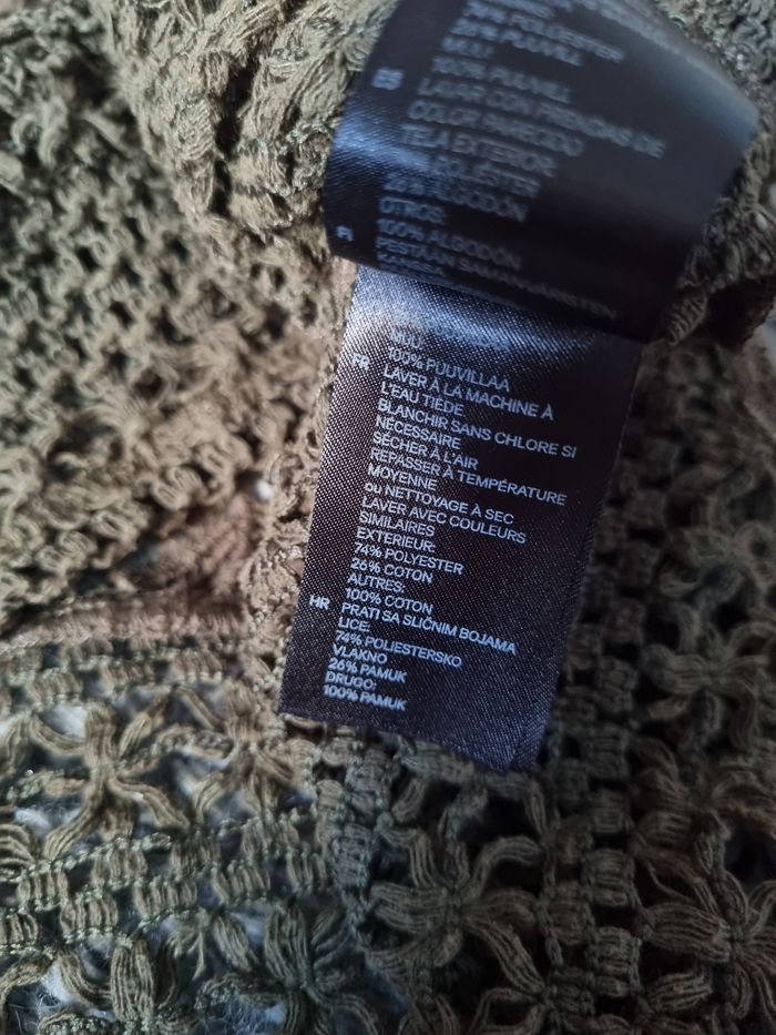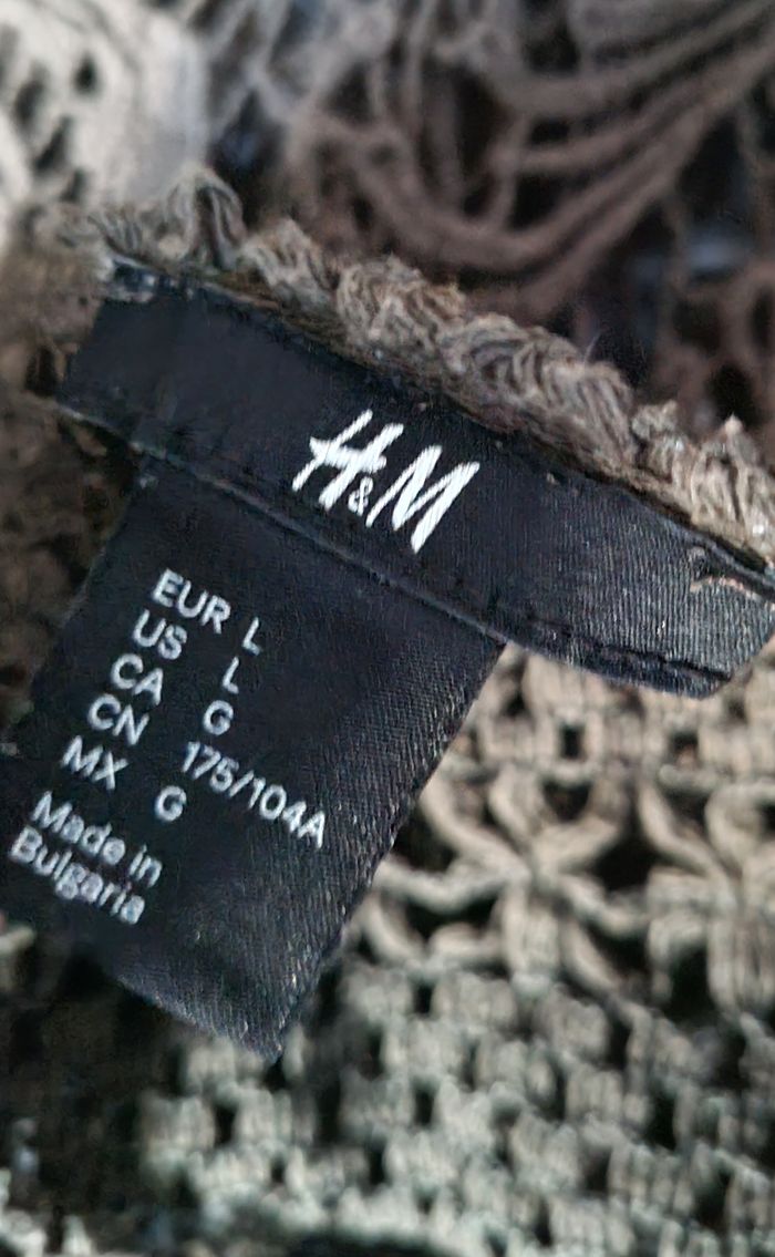 Pull kaki ajouré style crochet, taille L marque H&M, longueur 53cm, largeur 57cm, longueur épaule à aisselle 20cm,largeur aisselle à aisselle 59cm, longueur manches 44cm.