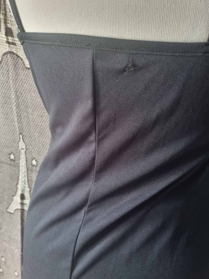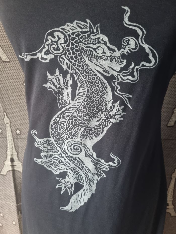 Robe longue noir à bretelles avec dragon imprimé, fendue sur un côté en bas,taille 36-40,longueur avec bretelles 138cm,largeur 48cm, longueur épaule à aisselle 28cm, largeur aisselle à aisselle 45cm, longueur sans bretelles 119cm,léger défaut voir dernière photo.