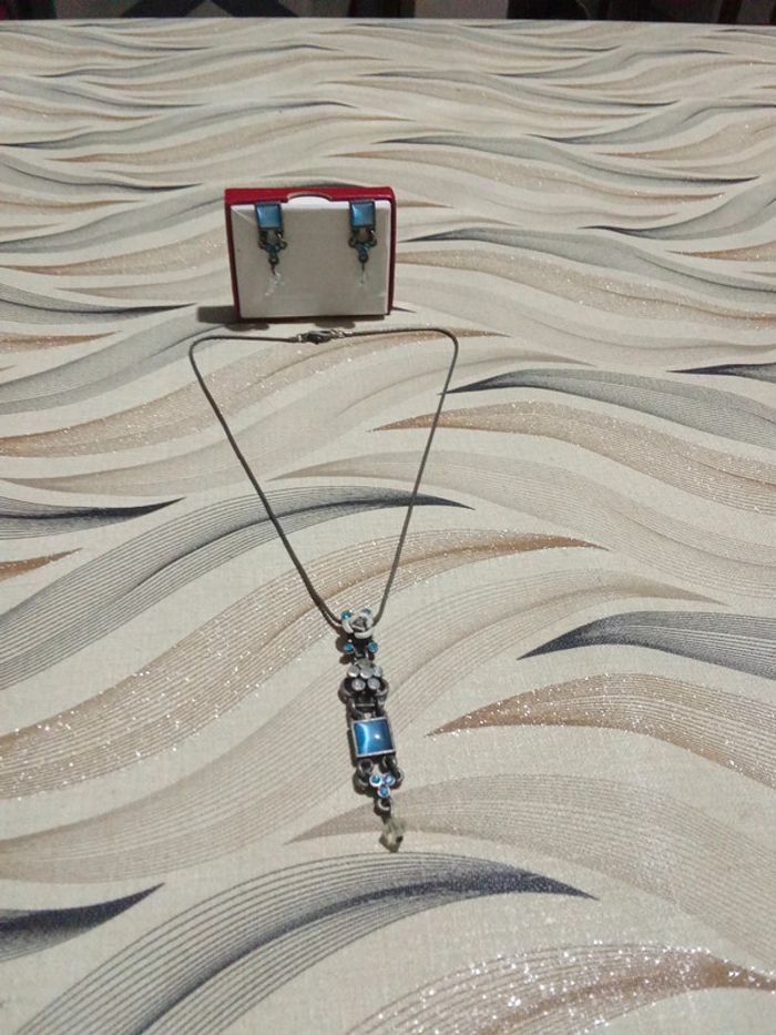 Ensemble collier boucles d'oreilles pierres bleues et motif fleurs - photo numéro 1