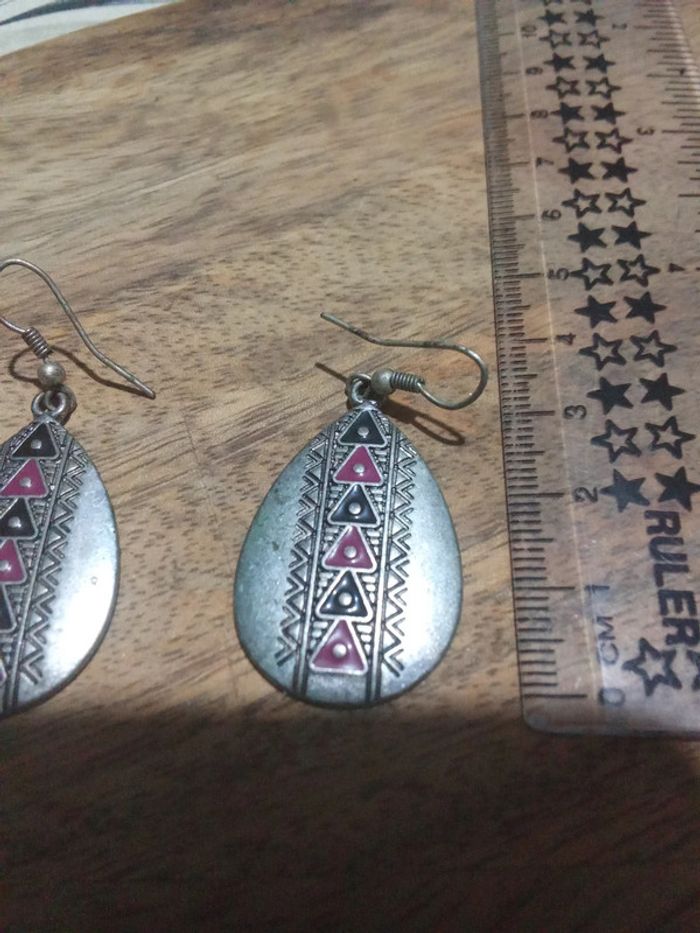 Boucles d'oreilles pendantes forme ovale motif triangle noir et fushia