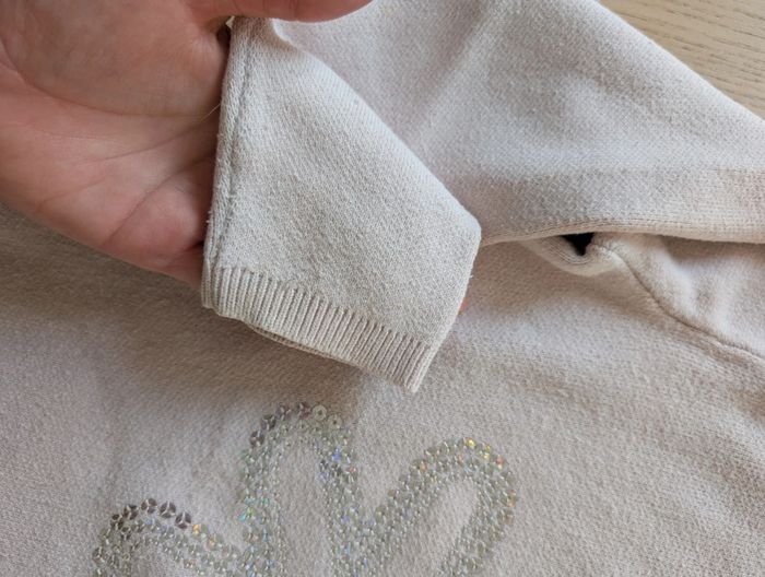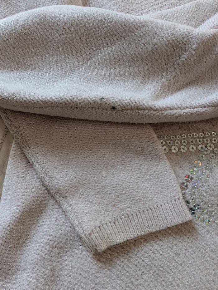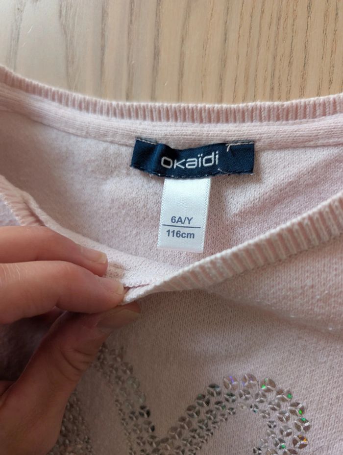 Pull rose pâle avec sequins. Marque Okaïdi Taille 6 ans 116cm. ⚠️ État satisfaisant : tâches sur les deux manches comme en photos et traces d'usure. #tennyteb6ans #okaidi #okaidifille