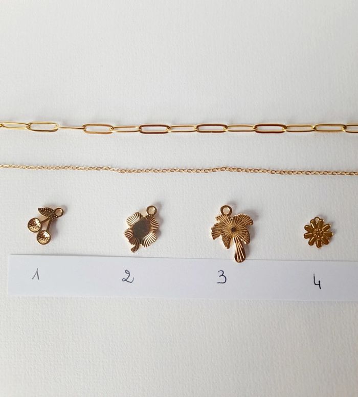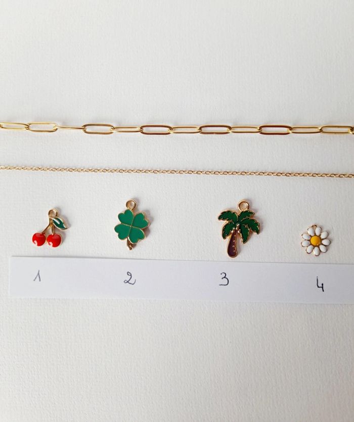 Neuf Acier inoxydable ✨️choisissez votre chaîne Petite maille 50cm max Grosse maille 40cm max 🌈choisissez votre breloque 📨envoyez moi votre demande. Envie de plus de charmes ? +1€ par charme #bijouxsurmesure #colliercharme #cerise #palmier #paquerette #trèfle