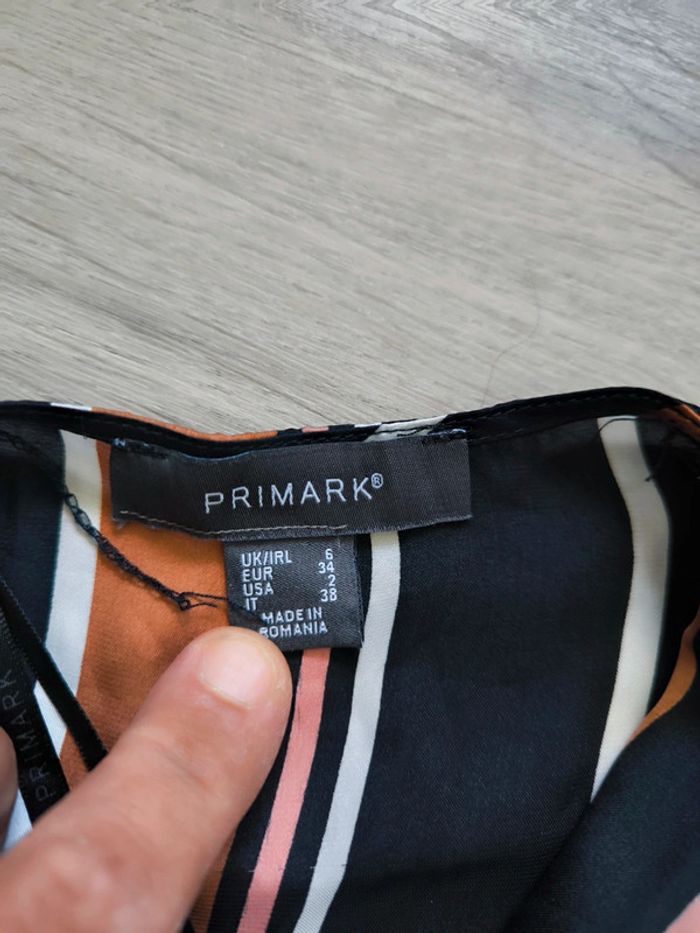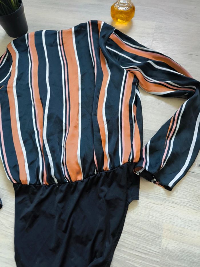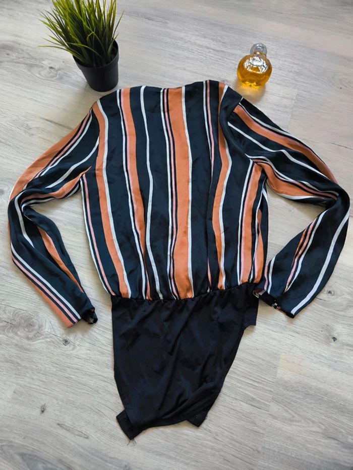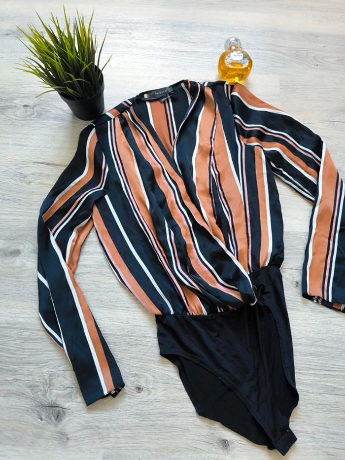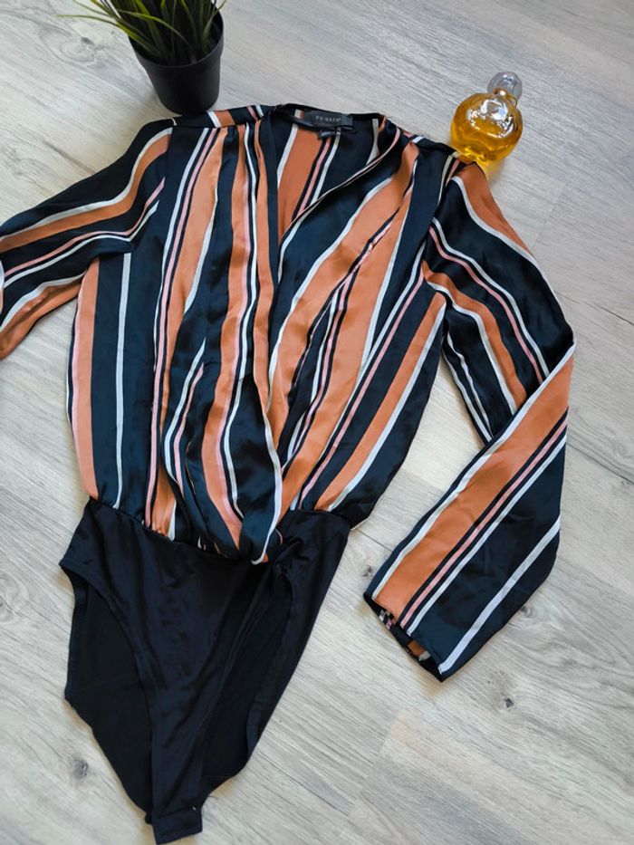 Vends un magnifique body femme Primark à rayures noires, camel et blanches, taille 34 (équivalent S/36, UK 6, USA 2, IT 38). Coupe portefeuille, matière fluide et agréable, idéal pour un look chic ou casual. Boutons pression à l’entrejambe pour plus de confort. Très bon état, peu porté !