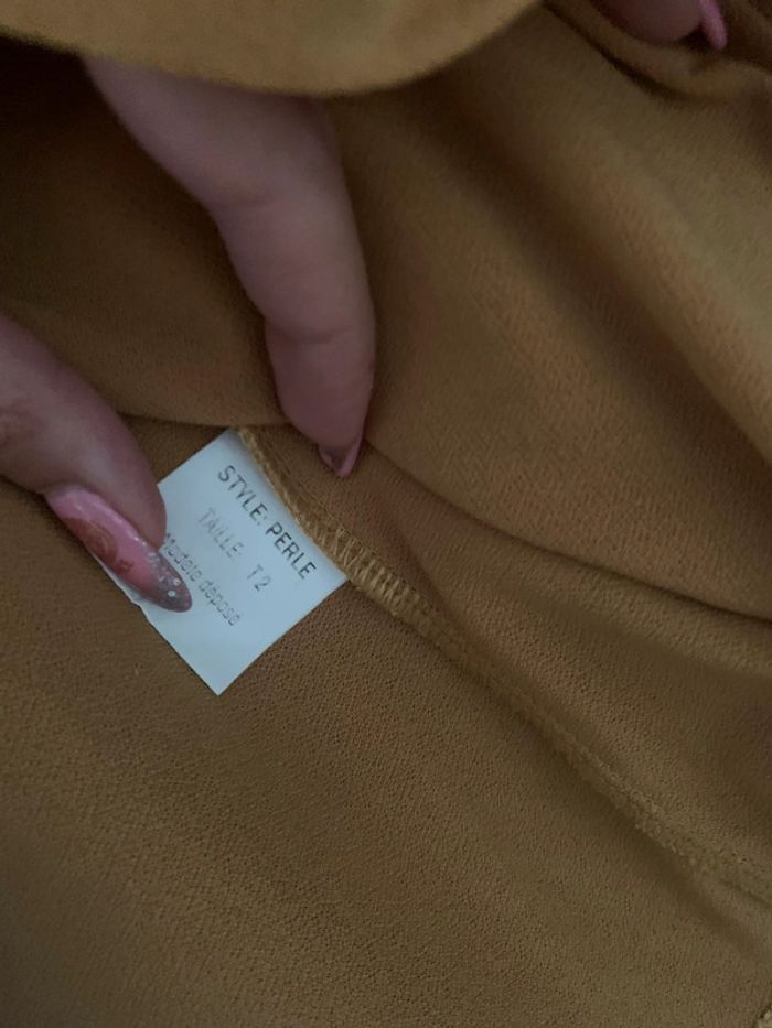 Couleur moutarde bonne état il y y’a une petite marque st le devant mais qui se voit très peu photo à l’appui Taille 2
