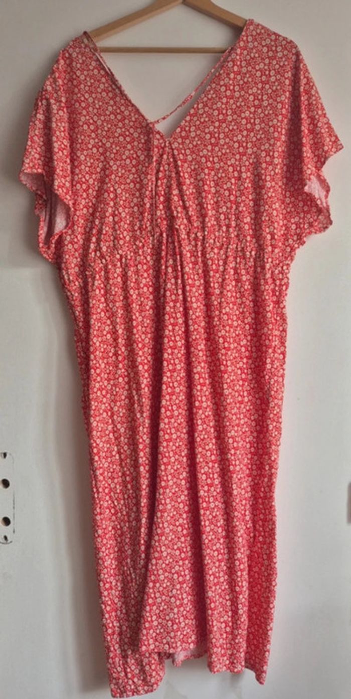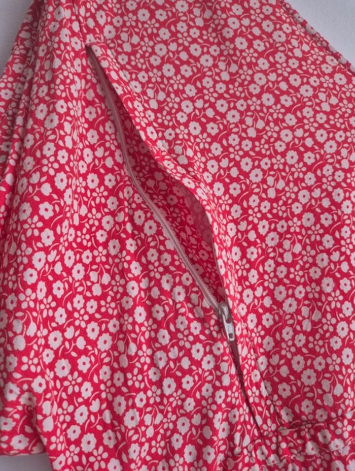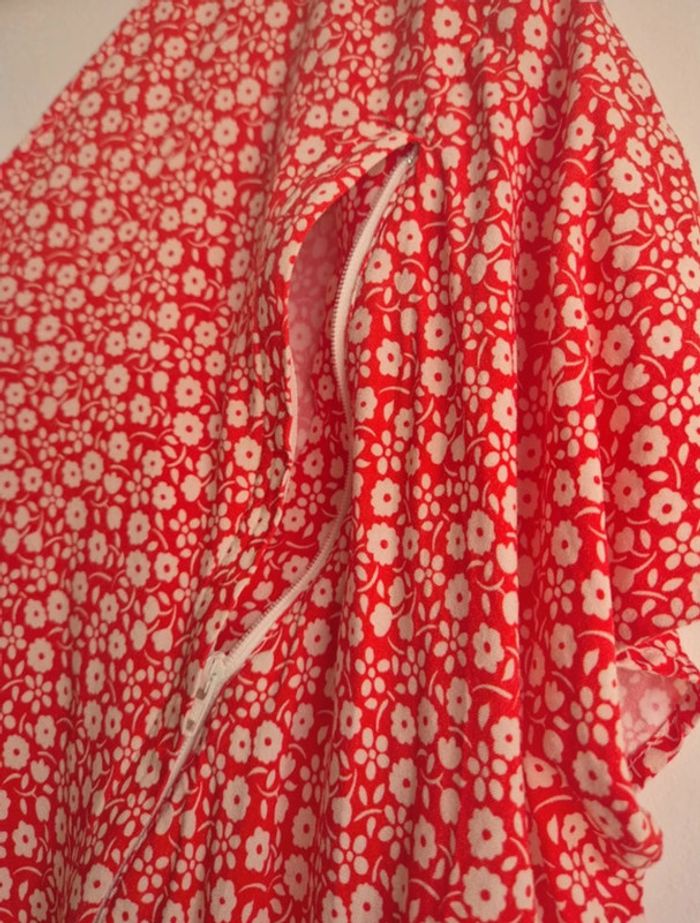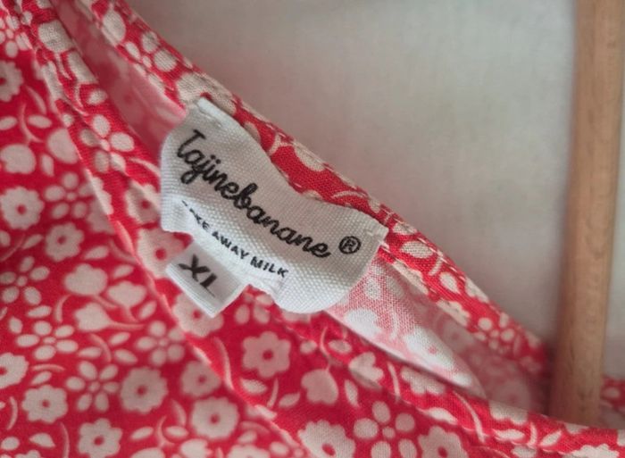 Jolie robe tajine Banane avec fermeture éclair pour faciliter l’ allaitement Rouge à fleurs blanche Achetée d’occasion mais ne correspond malheureusement pas à ma morphologie 😭