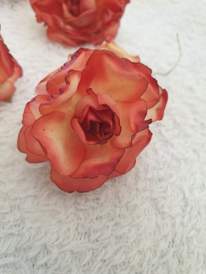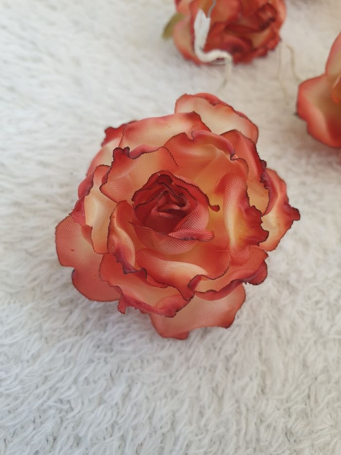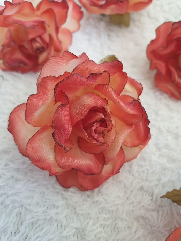 Ensemble de 6 roses. Avec une tige métallique. Elles mesurent environ 4,5cm de large. Neuves.