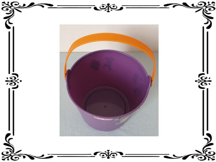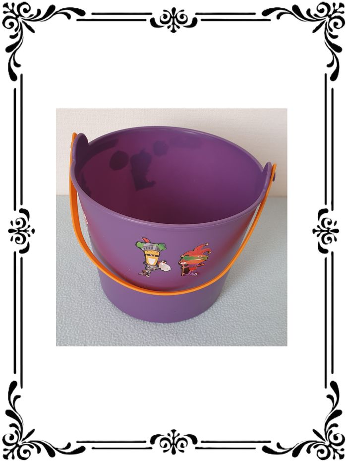 Seau à bonbons. Seau à bonbons violet avec anse orange. Hauteur : 12 cm Hauteur de la anse : 10 cm Diamètre à la base : 12 cm Diamètre en haut : 14,7 cm En bon état. Sans marque. 1,00€. #vero38110deguisements