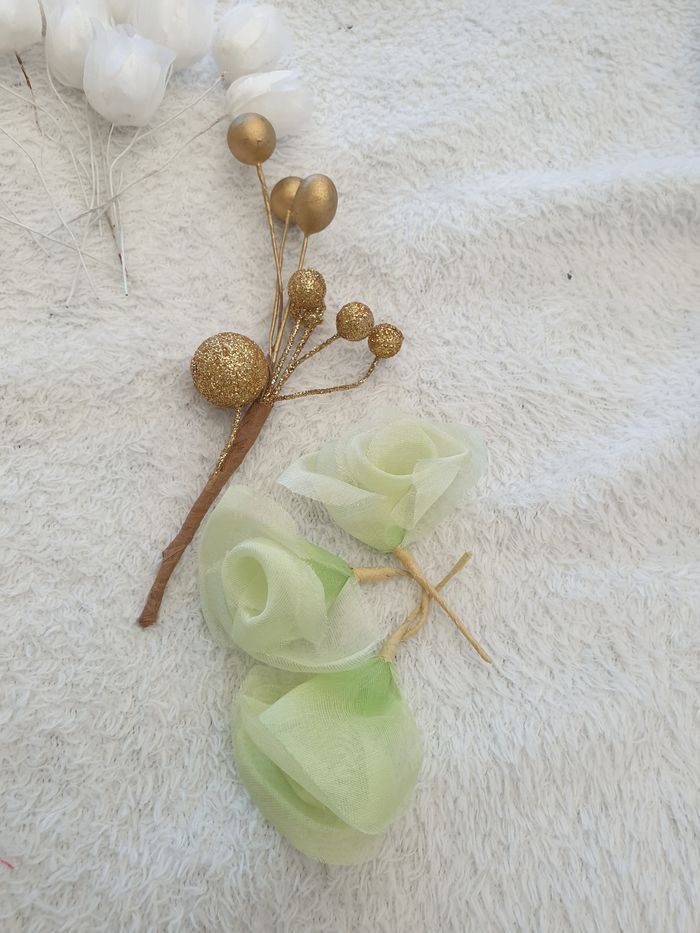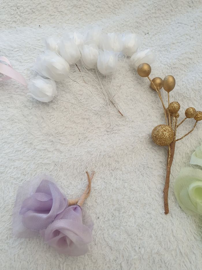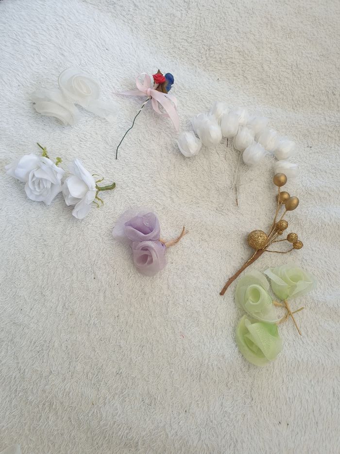 Ensemble de fleurs. Elles mesurent environ 10cm pour les plus grandes et 7cm pour les plus petites. Il y a environ 12 tulipes, 9 roses et 2 décorations florales.