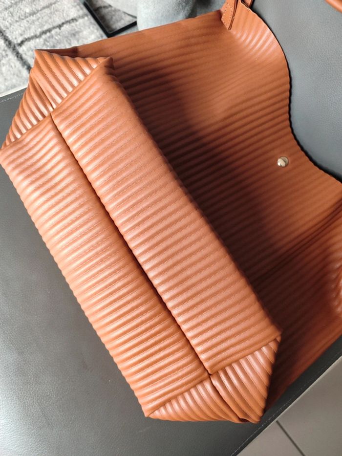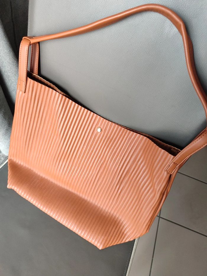 Cabas uni plissé Forme rectangulaire 1 anse porté épaule Fermeture par boutons aimantés Dimensions : 32 x 40 x 15 cm Coloris camel
