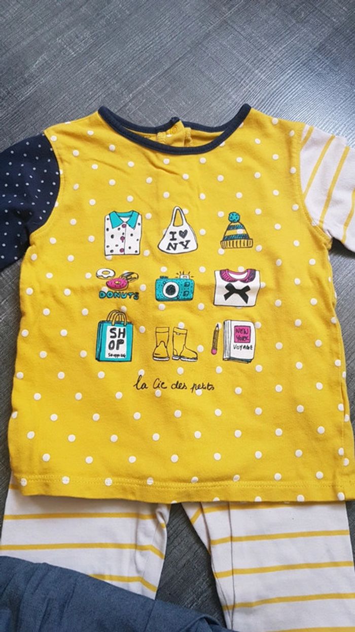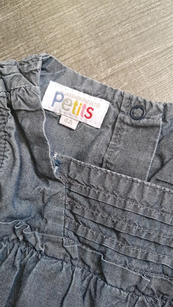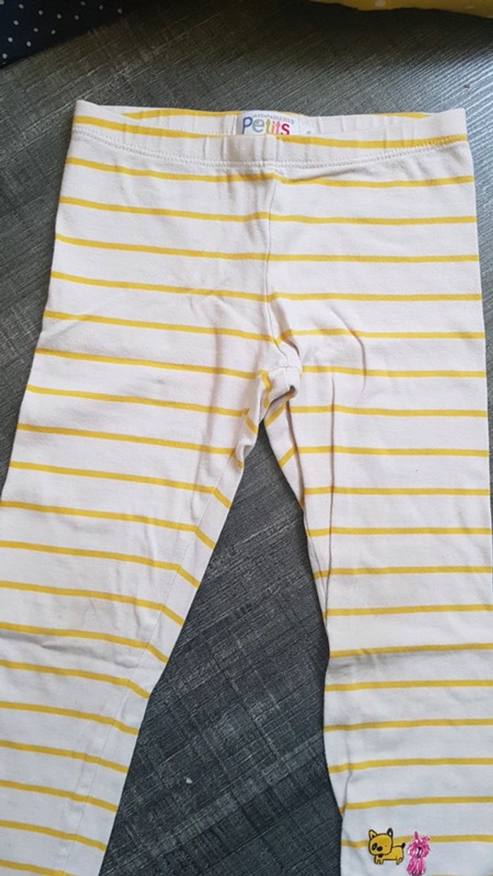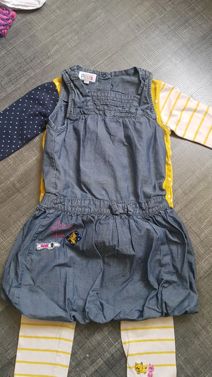 4ans La compagnie des petits Ensemble robe boule Jean léger Legging blanc rayures jaune T shirt manches longues jaune et bleu marine Un petit endroit décousu dans la robe mais facilement réparable( voir photo) #elodietopart_fillequatreans