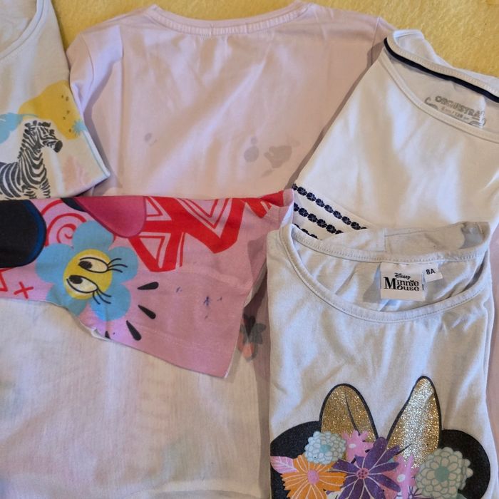 Lot de 6 hauts : 2 manches longues et 4 manches courtes. Attentions ⚠️ le lot présente des tâches et de l'usure, mais les vêtements peuvent encore dépanner ⚠️ Taille 8ans. Orchestra, minnie, du pareil au même.