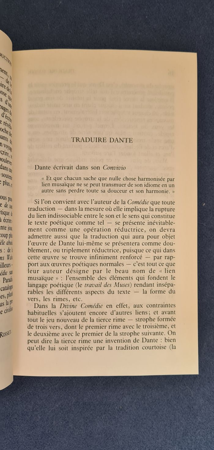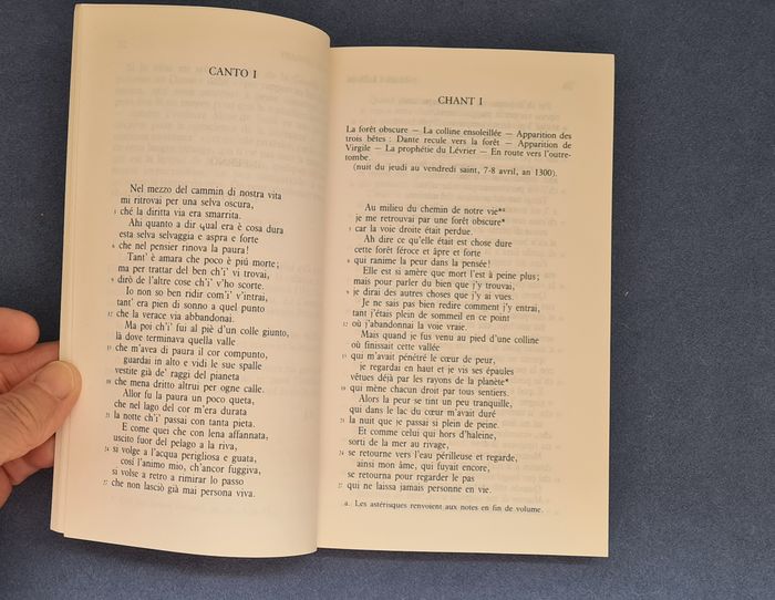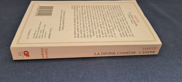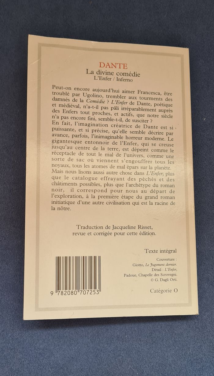 La Divine Comédie - L'Enfer Version Bilingue Dante Traduction, introduction et notes de Jacqueline Risset GF Flammarion Texte intégral Les versions françaises et italiennes sont imprimées en face à face sur chaque double page. Permet de lire les 2 versions en "simultané" pour apprécier toutes les subtilités du texte. Format type poche : 17.8 x 10.8 Lors de la lecture utilisation de marque-page. Pas de page cornée, ni d'annotations En très bon état #classique #littératureitalienne #dante #versionbilingue #françaisitalien #flammarion #lenfer #ladivinecomedie #jacquelinerisset #mar-taylivre