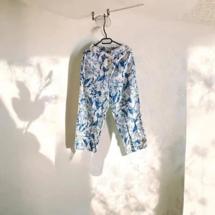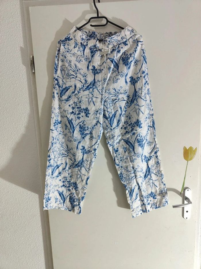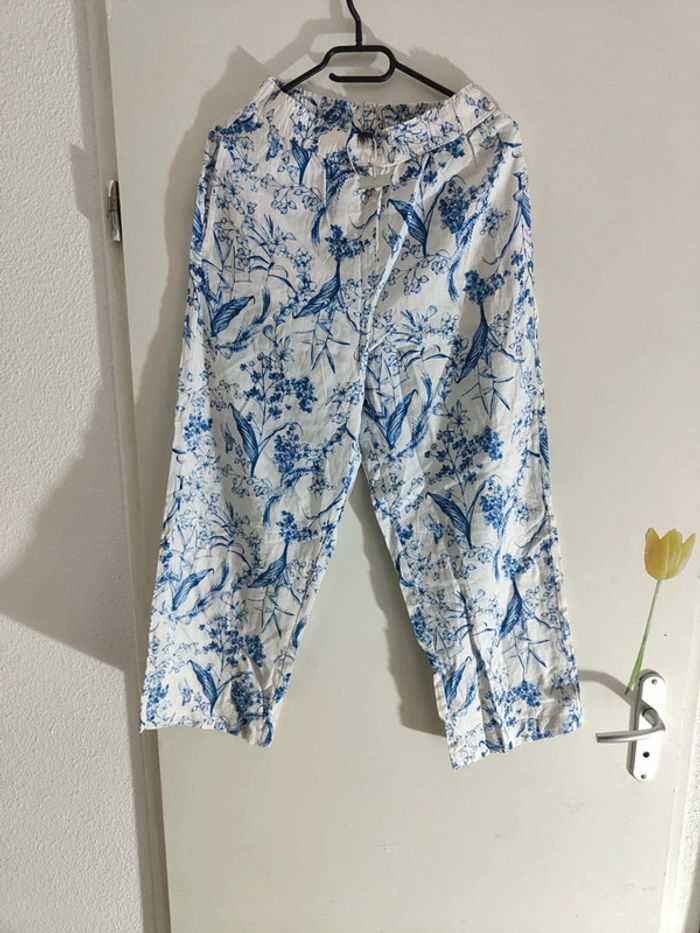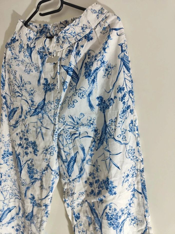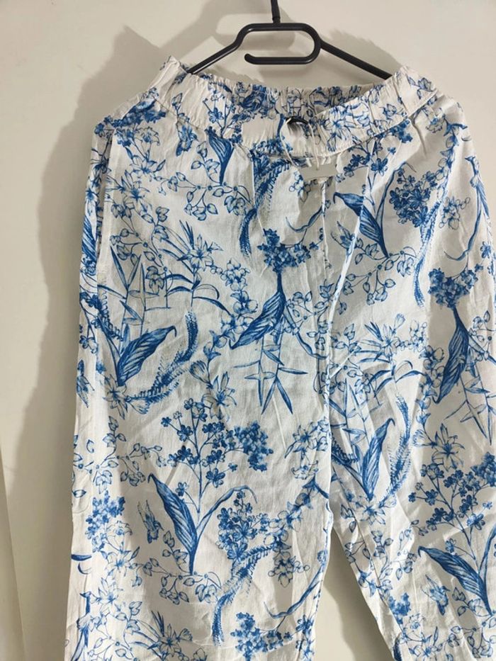 Pantalon Imprimé en Coton Floral Bleu et Blanc - photo numéro 1