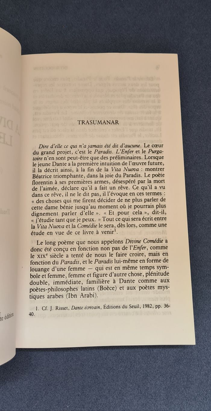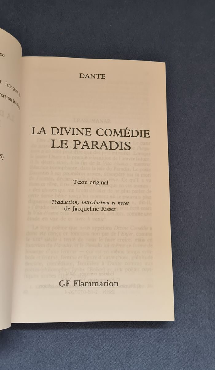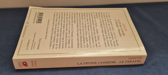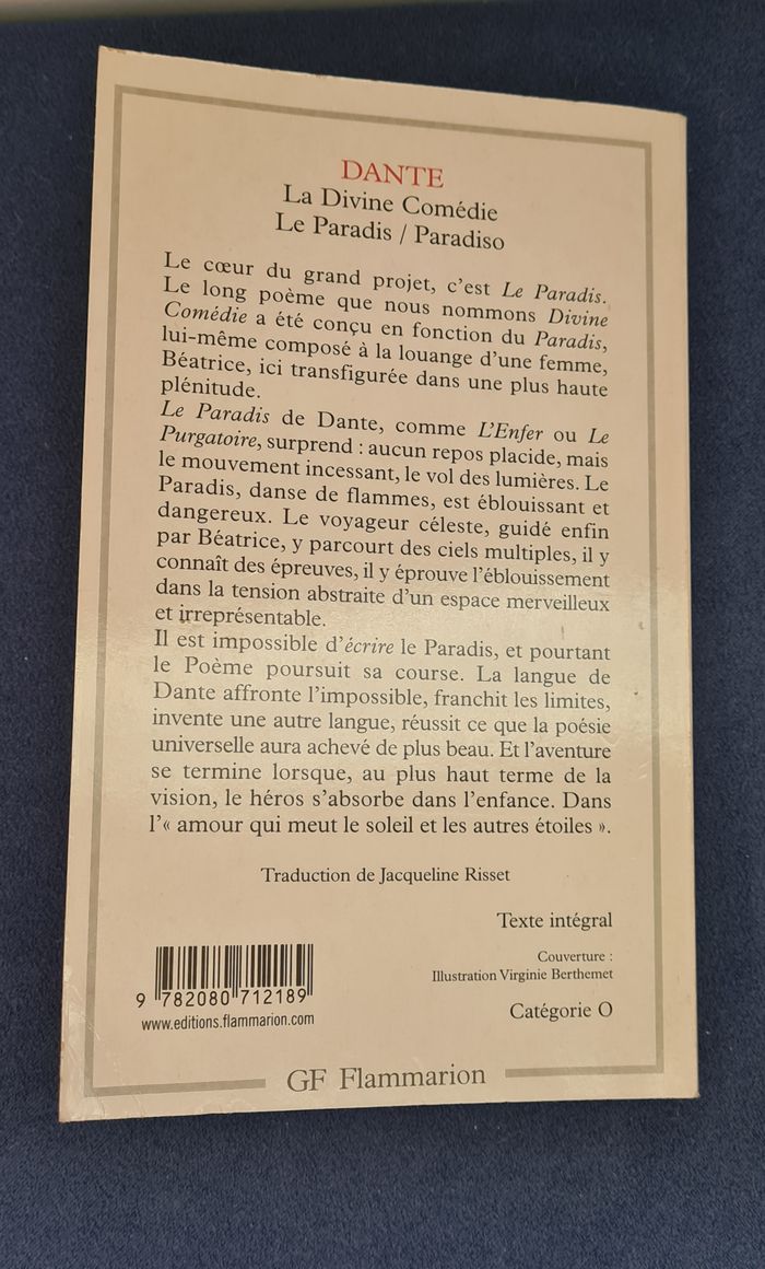 La Divine Comédie - Le Paradis Version Bilingue Dante Traduction, introduction et notes de Jacqueline Risset GF Flammarion Texte intégral Les versions françaises et italiennes sont imprimées en face à face sur chaque double page. Permet de lire les 2 versions en "simultané" pour apprécier toutes les subtilités du texte. Format type poche : 17.8 x 10.8 Lors de la lecture utilisation de marque-page. Pas de page cornée, ni d'annotations En très bon état #classique #littératureitalienne #dante #versionbilingue #françaisitalien #flammarion #leparadis #ladivinecomedie #jacquelinerisset #mar-taylivre