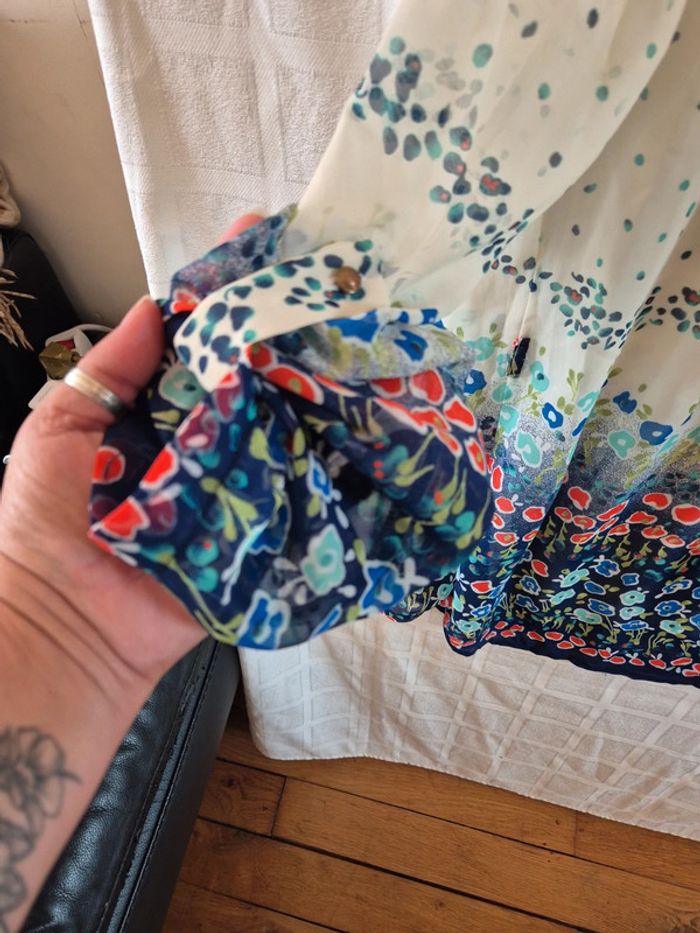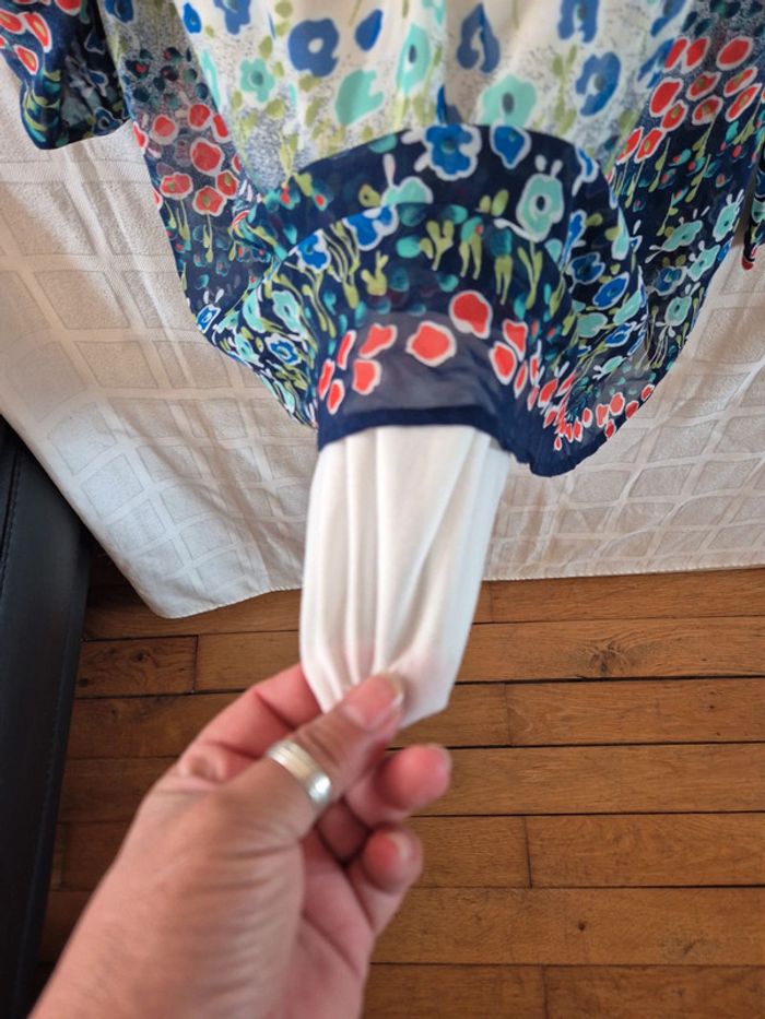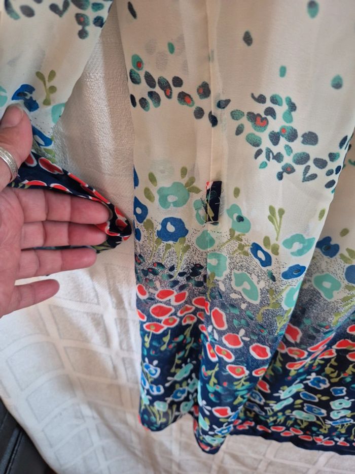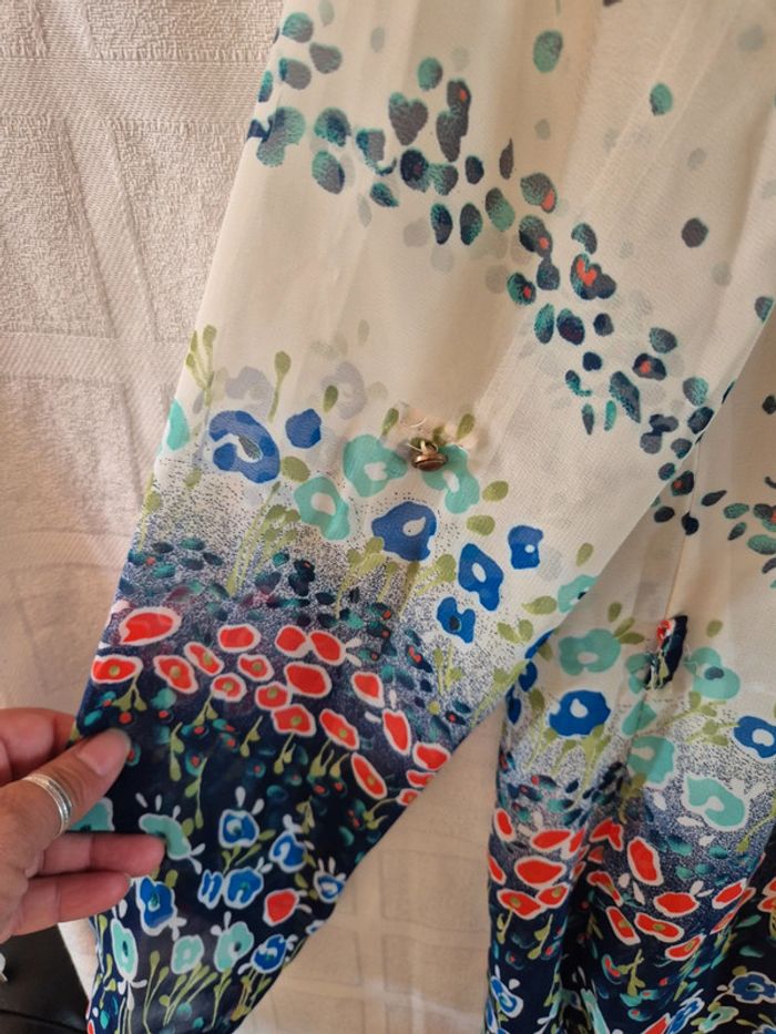 ⬇️mes autres annonces pour femme en taille 38 👉 #cg89femme38 une robe doublée donc non transparente avec des manches longues que l'on peut attacher grâce à un bouton sur la manche. Des passants sur le coté pour mettre une ceinture. Elle mesure 77 cm de longueur. Elle peut également se porter en tunique très bon état - taille 38 - marque Mece #tunique #plage #robe #blouse #été