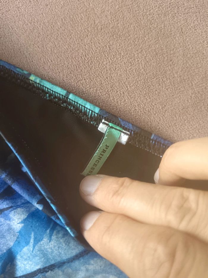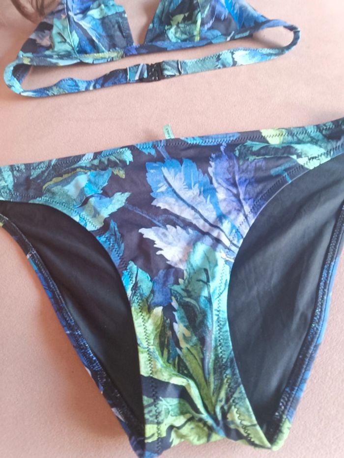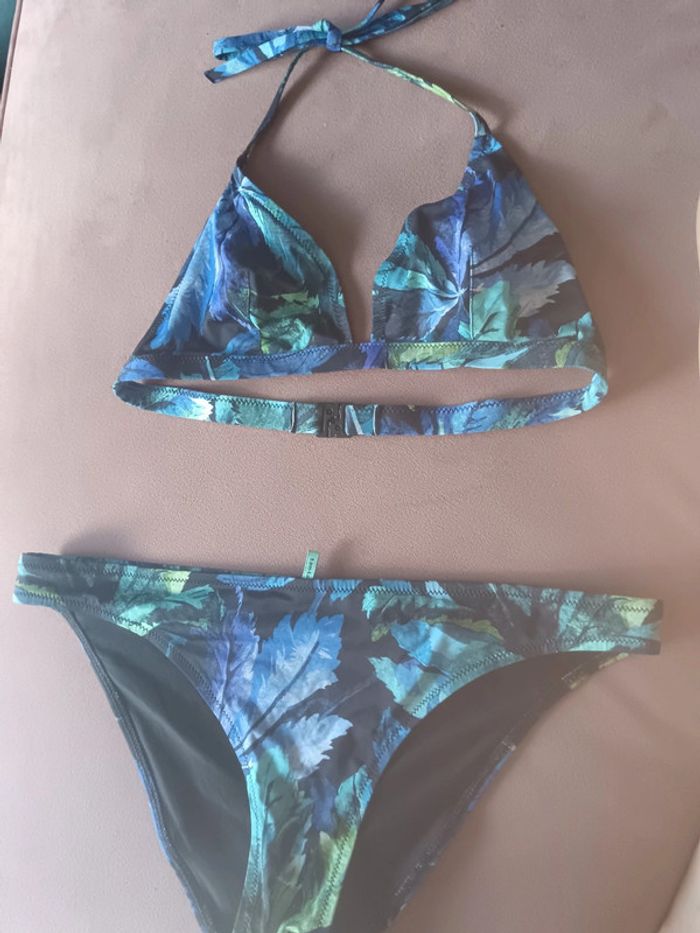 Joli maillot de bain 2 pièces très bon état feuillage bleu vert violet marque Princesse tam tam, plus l'étiquette de la taille mais taille M, sans rembourrage dans le haut mais vous pouvez en rajouter si vous en avez.