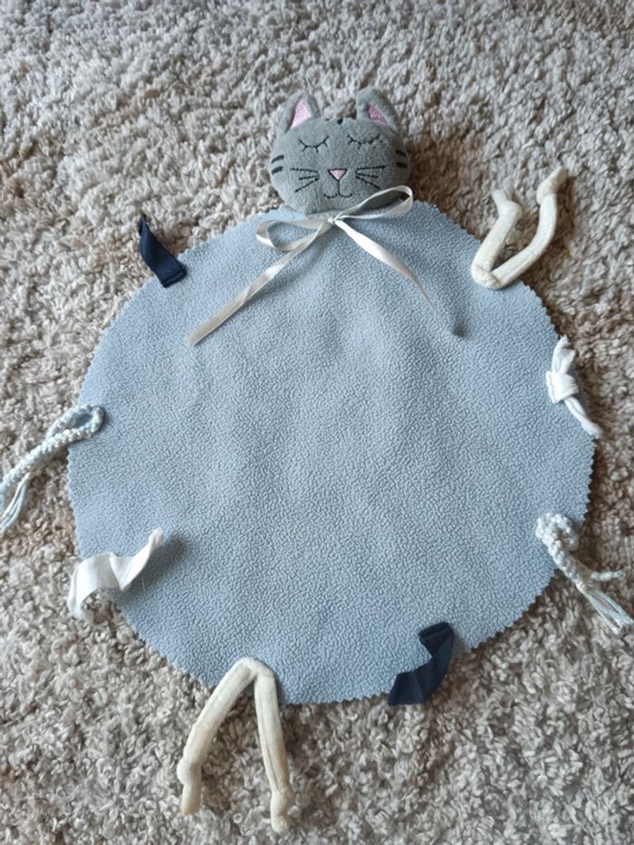 Mignon doudou mouchoir chat avec pleins de petites cordes rubans à tripoter. Je ne sais malheureusement pas la marque. Très bon état