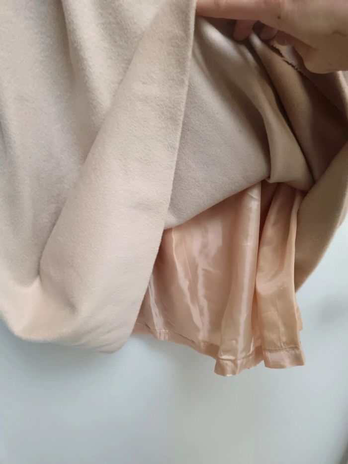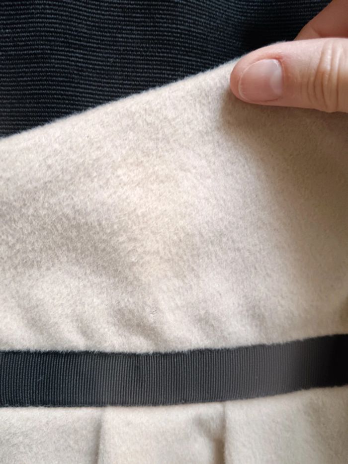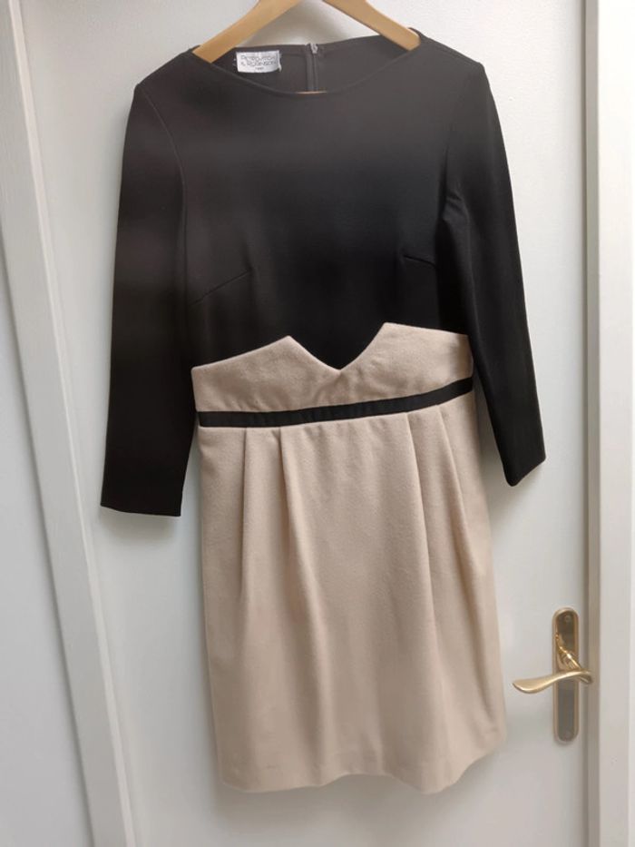 Robe originale bicolore effet jupe taille haute ceinturé, en haut matière élastique, bas beige matière plutôt chaude pour l'hiver, doublure à l'intérieur, fermeture éclair à l'arrière, un mini petit défaut à peine visible sur la dernière photo sinon très bon état