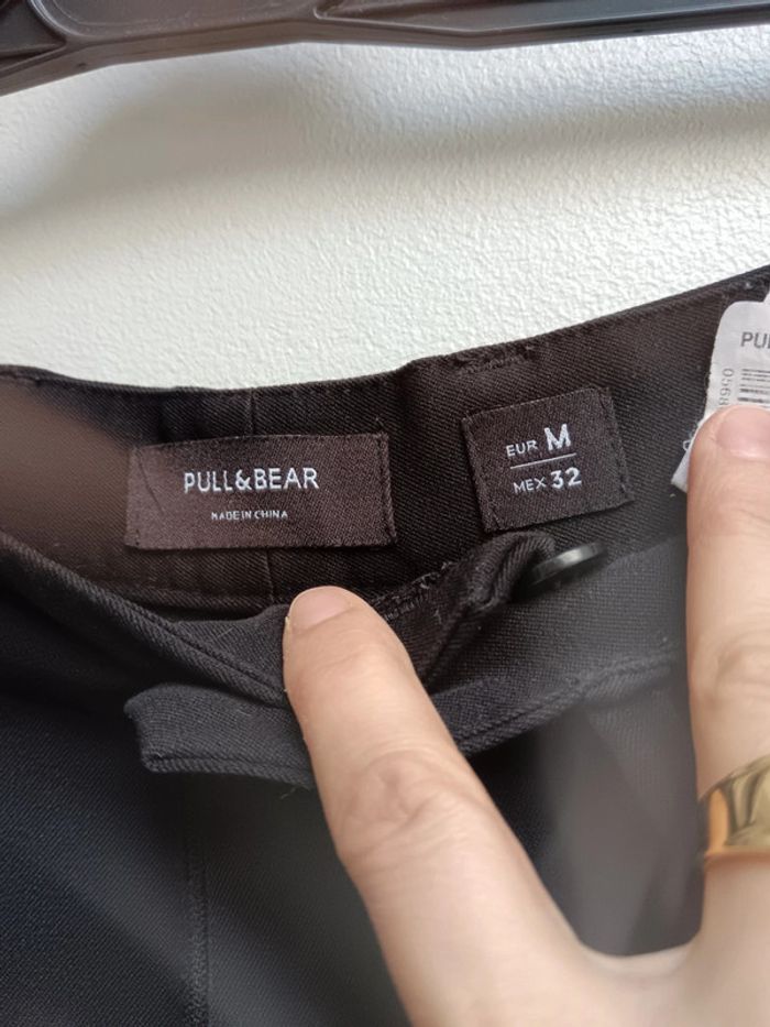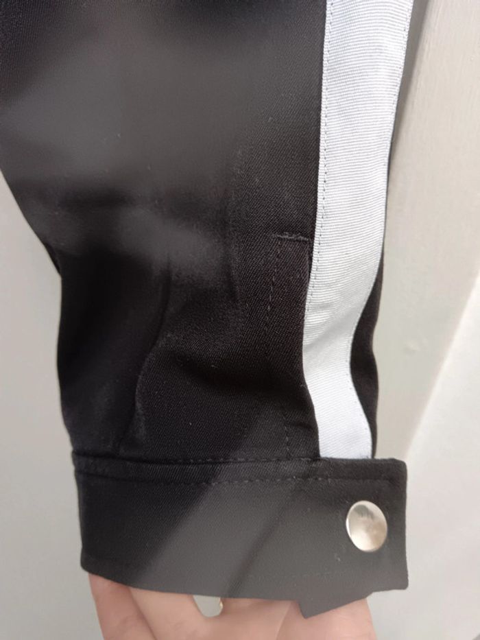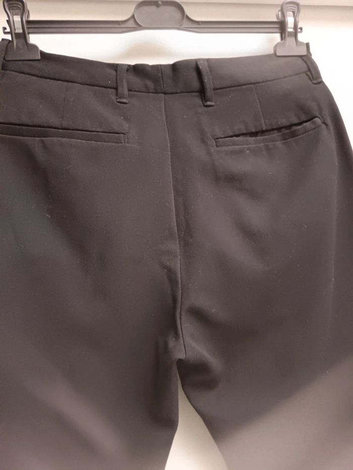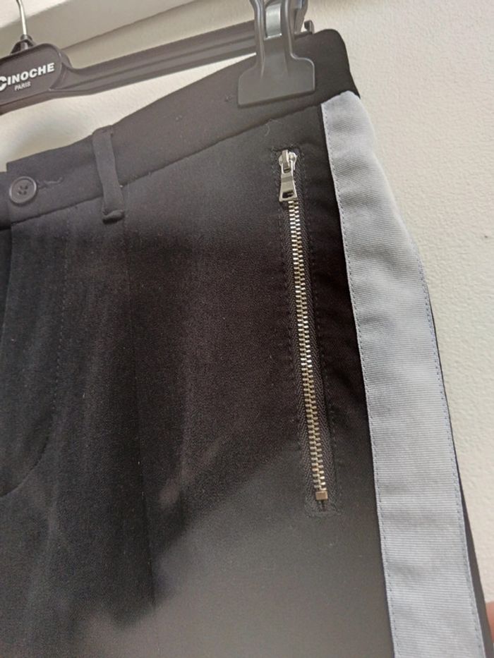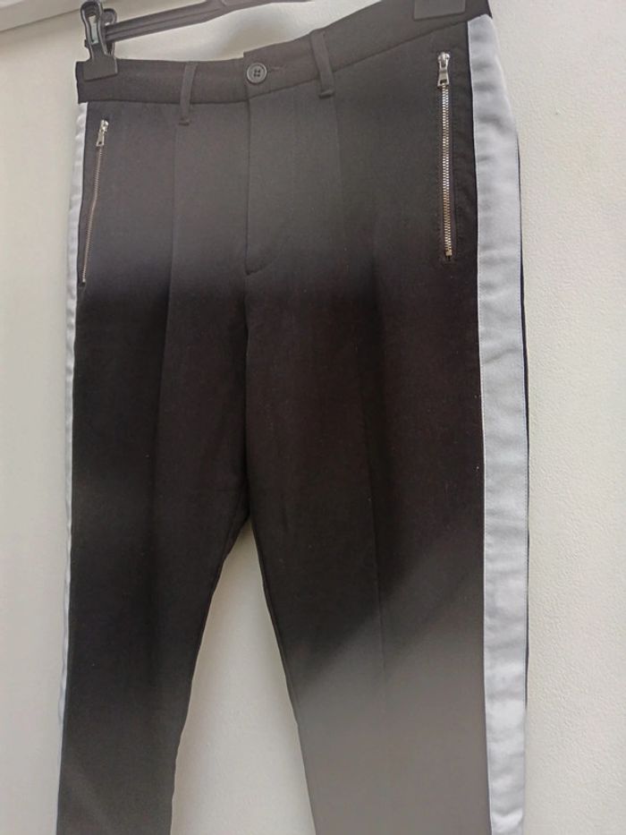 Pantalon noir avec bande gris clair sur le côté , pression en bas, poches avec fermeture éclair taille M