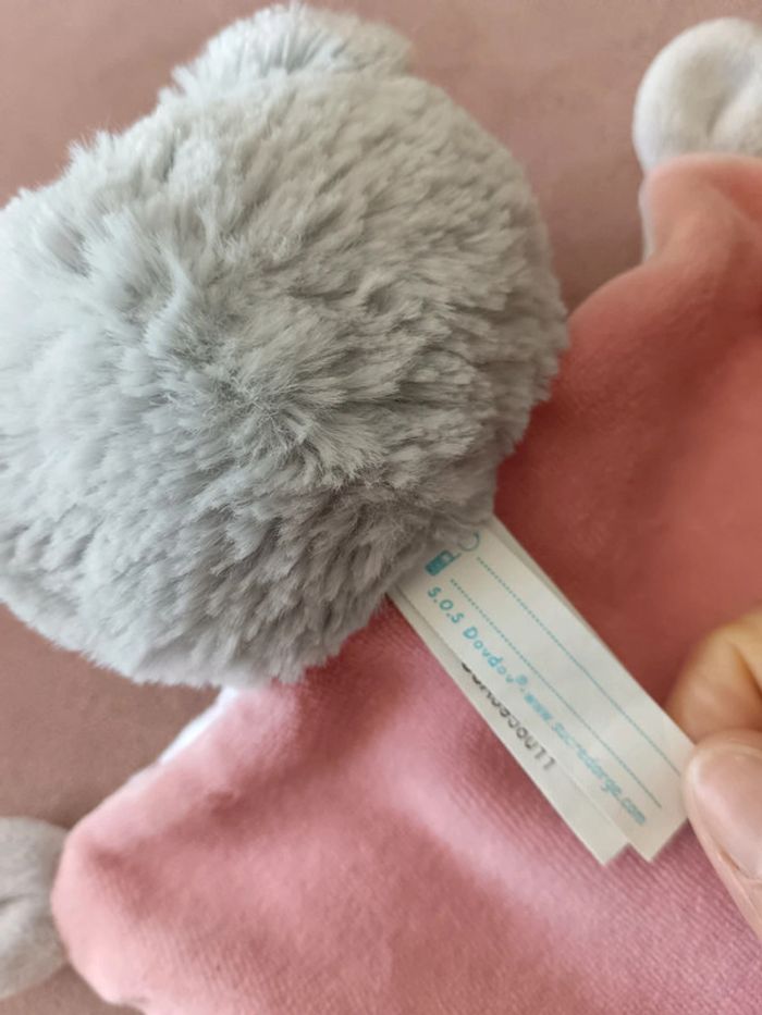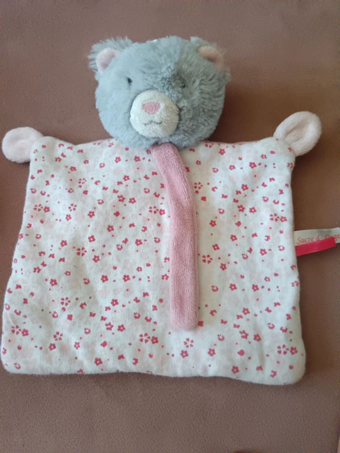 Peluche doudou carré plat marque Sucre d'orge avec ficelle rose devant pour faire un noeud à la tétine si besoin.parfait état