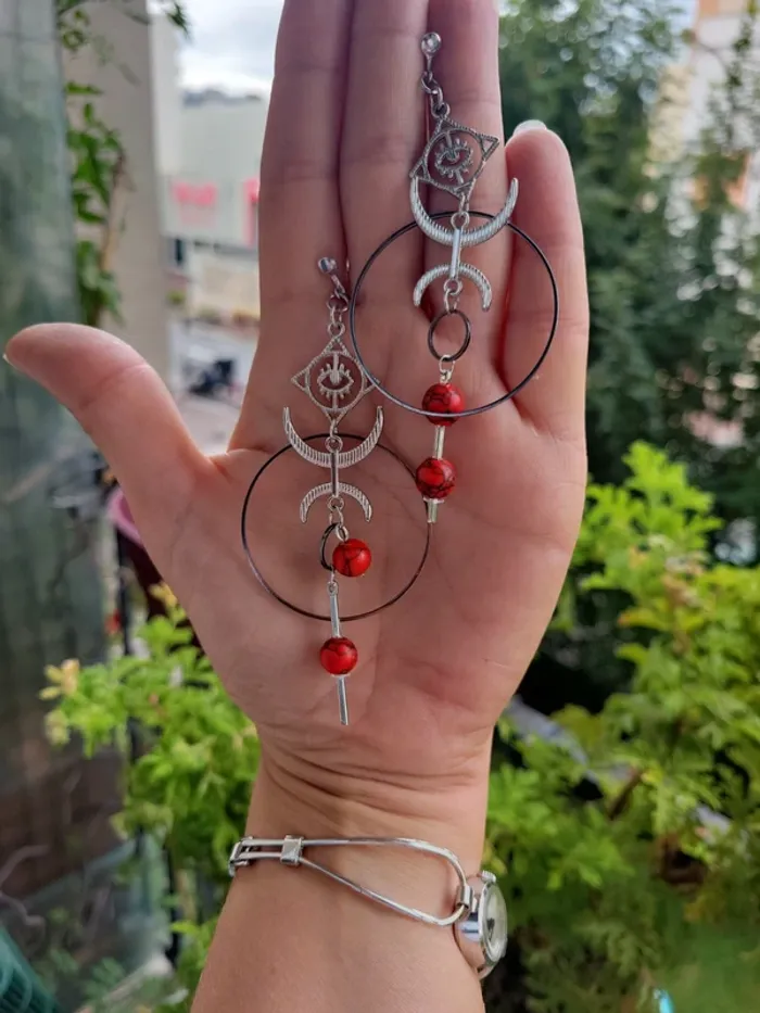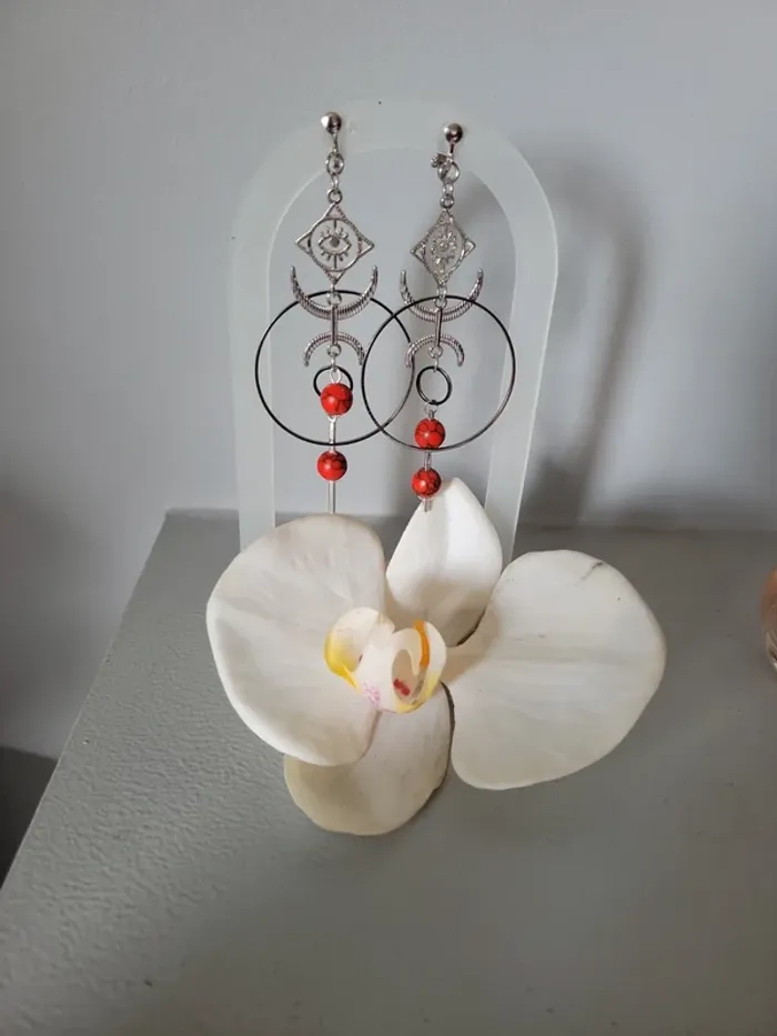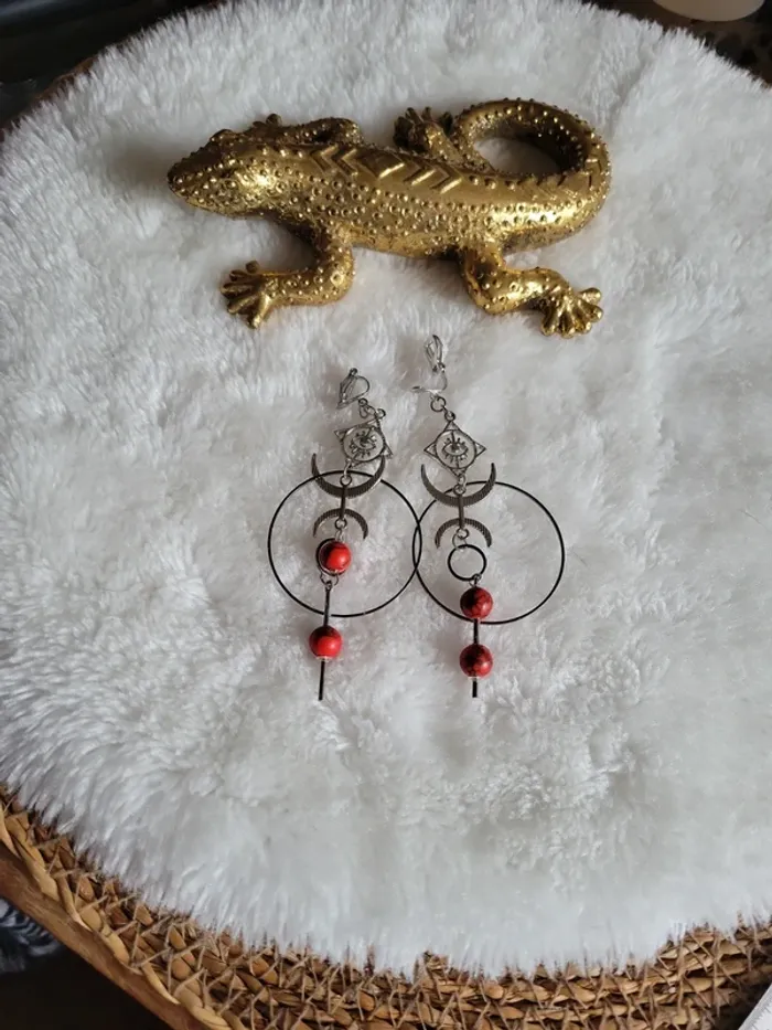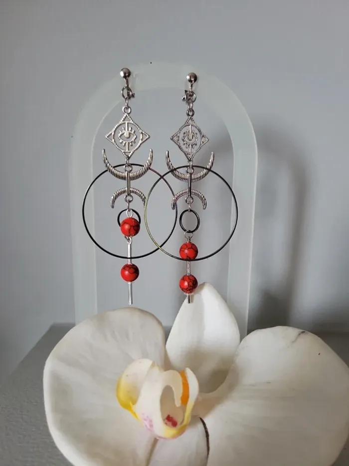 Clips d oreilles 👂 (percées ou non) Asymetriques lune et soleil. Acier inoxydable et pierres semi précieuses turquoise rouge. Modèle unique. Fait main. Lithothérapie. Même modèle decliné avec d autres pierres (oeil du tigre, turquoise, jade, jaspe impérial). Possible pour oreilles percées sur demande.. Lot possible. Envoi sous 24h48h. Rapide et soigné.