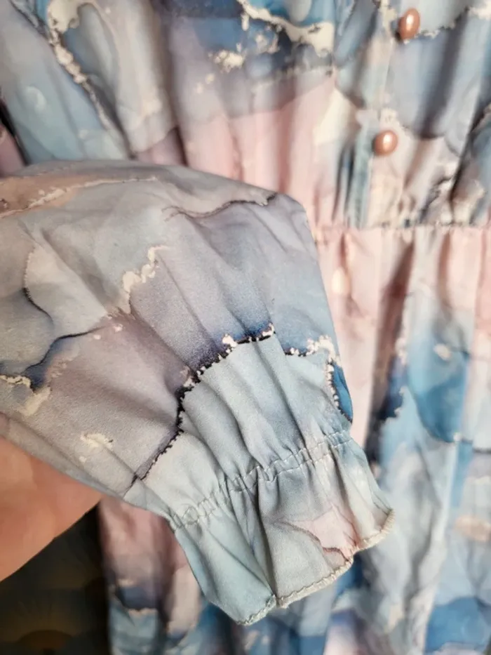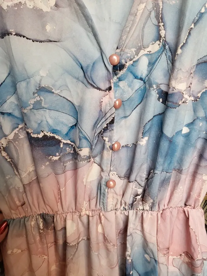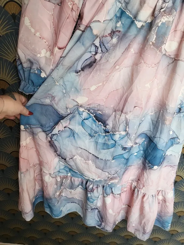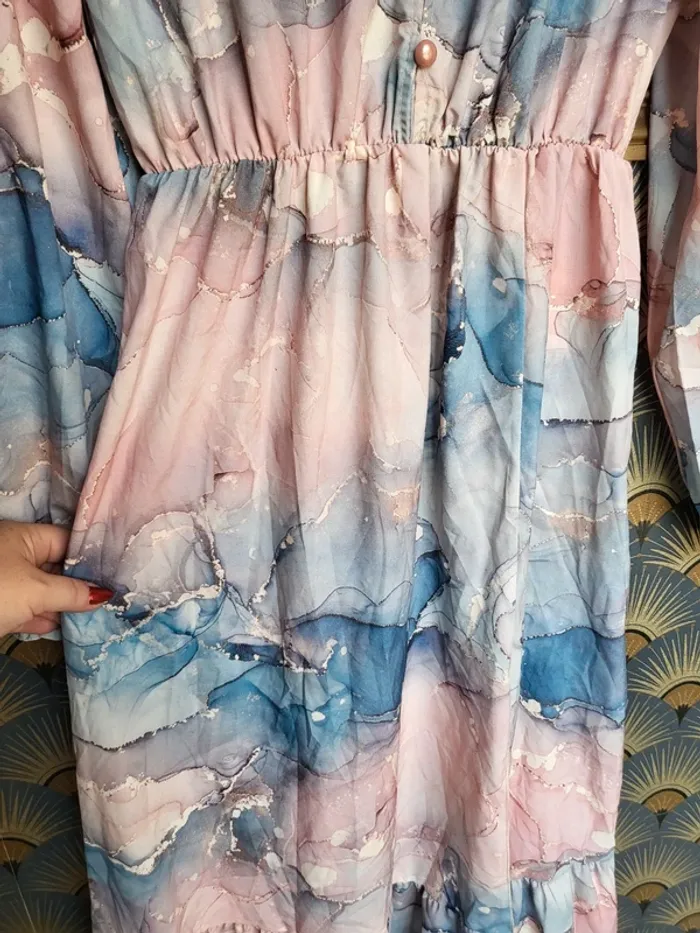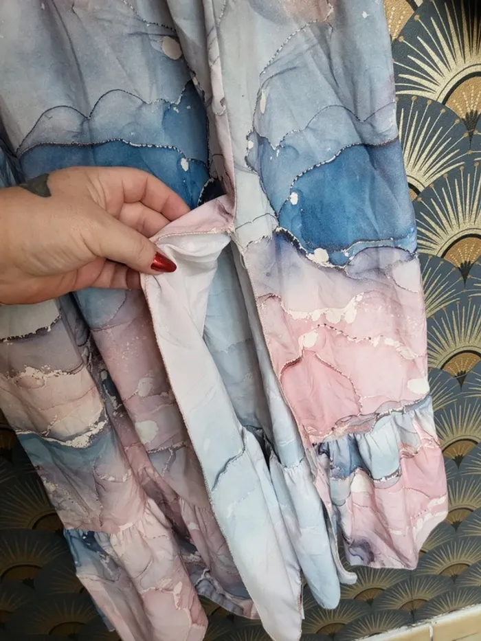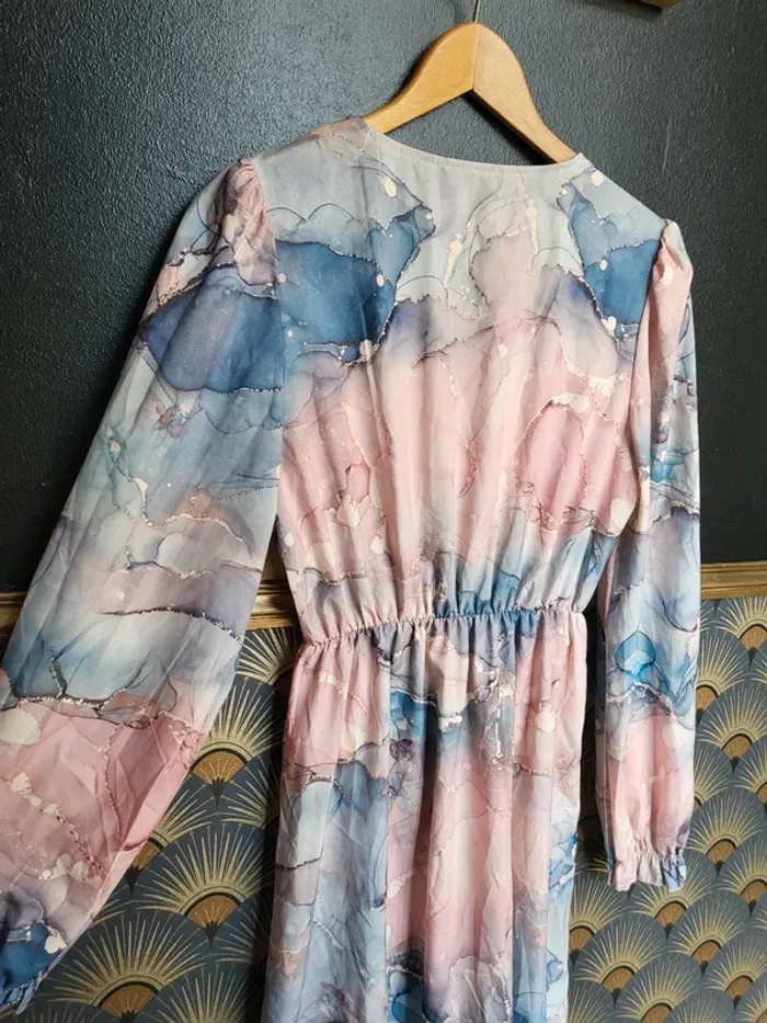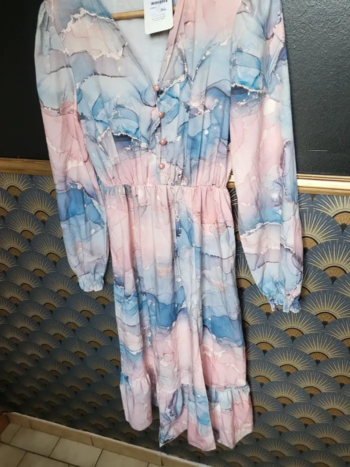 Taille élastique. Longueur total 120cm. Ouverte sur le devant voir photo 7 à partir de 74cm. Taille 36/38