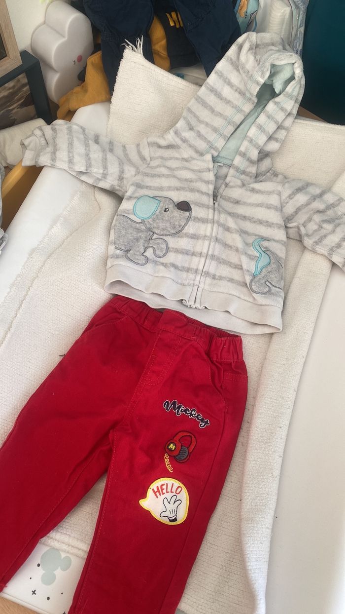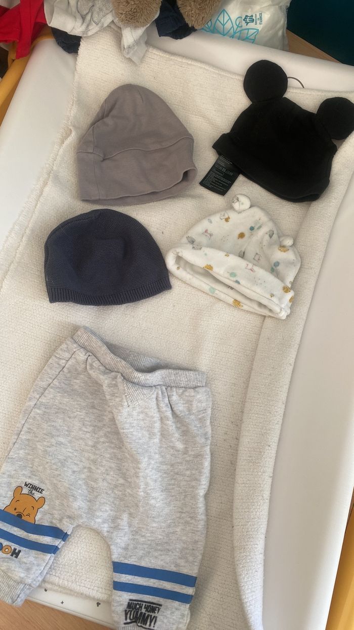 Il y a : Bodys ML et pyjama. Ensemble veste et jogging Jogging Pantalon Vestes Bonnets + 1 qui n’est pas en photo Mandeau rouge qui n’est pas en photo Salopette + petite chaussures.