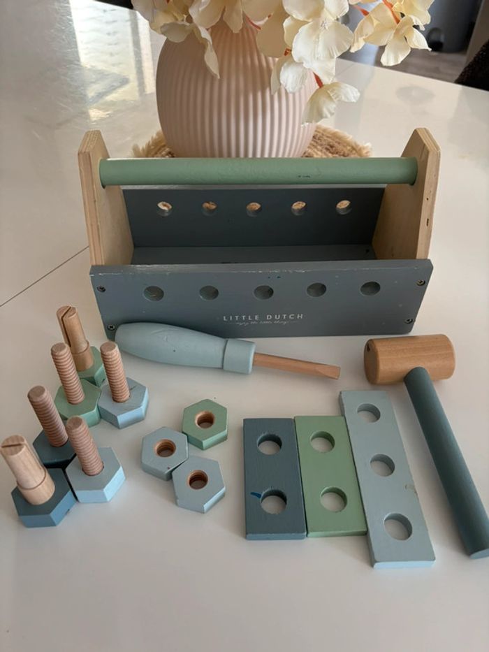 Boîte à outils en bois Il manque quelques pièce mais reste en bon état.