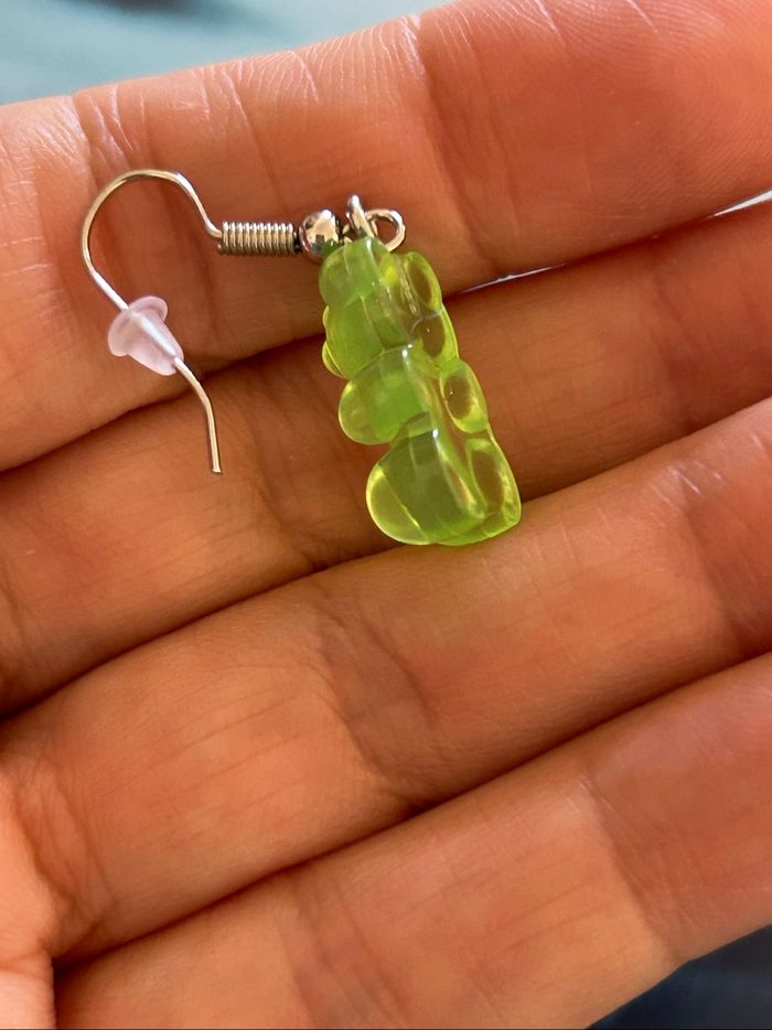 Je vends cette paire de boucles d’oreilles," Mon Bonbon Ourson " l'ourson est en résine vert anis Adorables oursons non sans rappeler les friandises !! (Haribo ) présentées dans une pochette en organza , boucles neuves , idéal pour un petit cadeau remise en main propre à Chartres , ou envoi rapide et très soigné