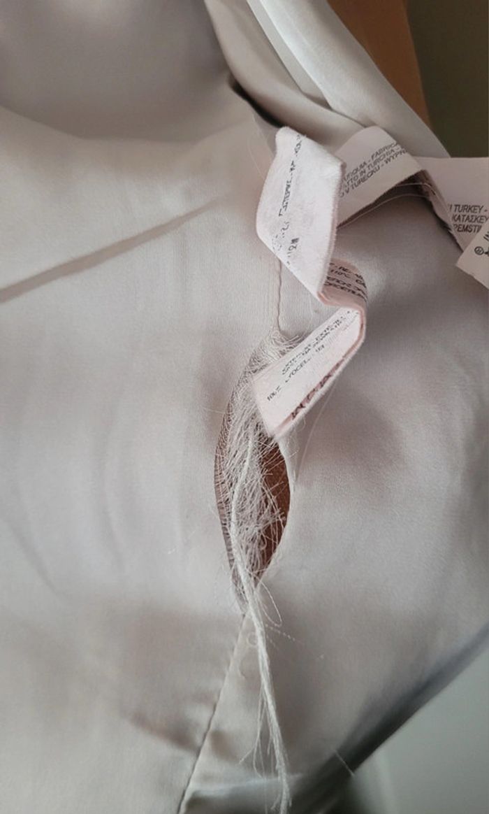 Blazer Zara En bon état général hormis un petit trou au niveau de l'épaule droite. Ma doublure intérieure est également déchirée à un endroit (voir dernières photos) Taille xs Mesure sous aisselles : 52cm (valeur approximative car pas de bouton) Longueur : 75cm