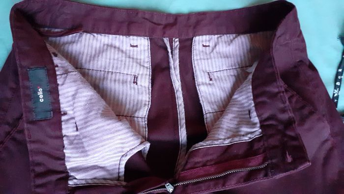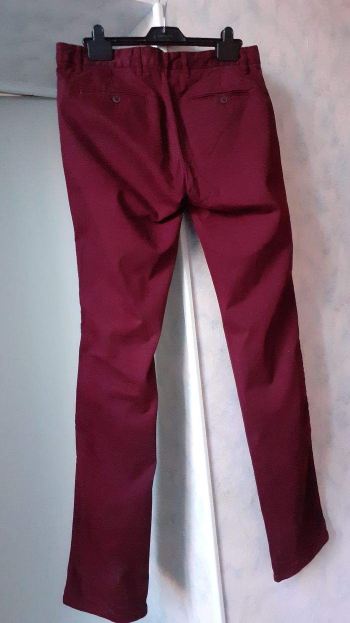 Vends un pantalon de ville en toile, 2 poches latérales, 2 poches plates avec bouton derrière, couleur bordeaux, marque Celio, taille M. Quasiment neuf. Longueur entrejambe : 87 cm Largeur de la ceinture à plat : 42 cm.