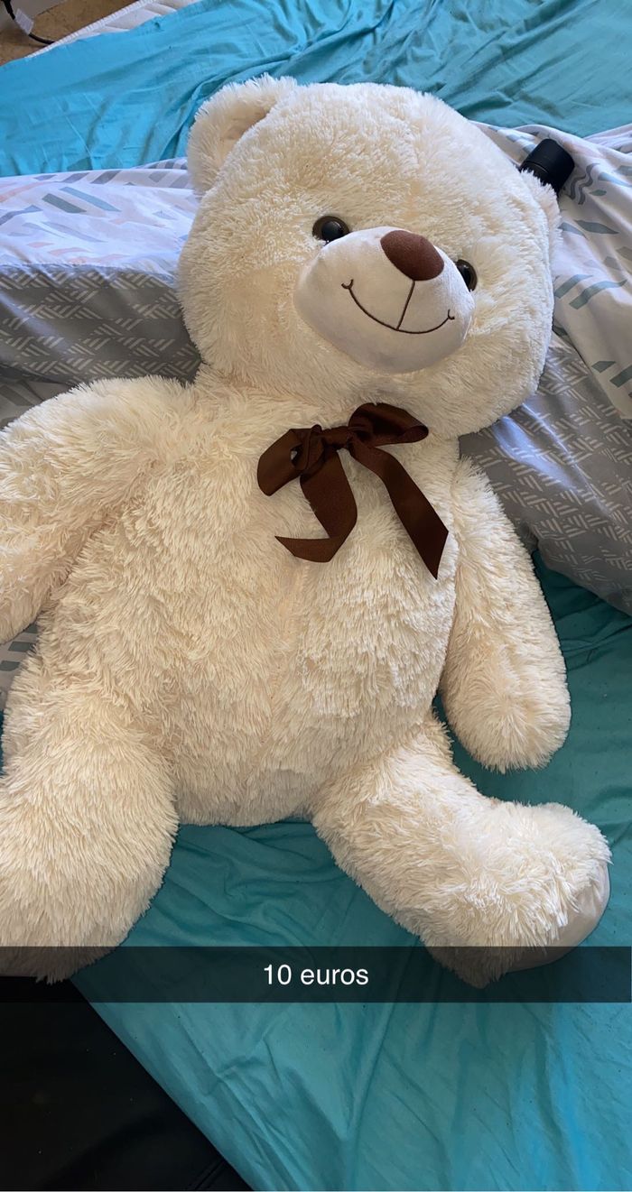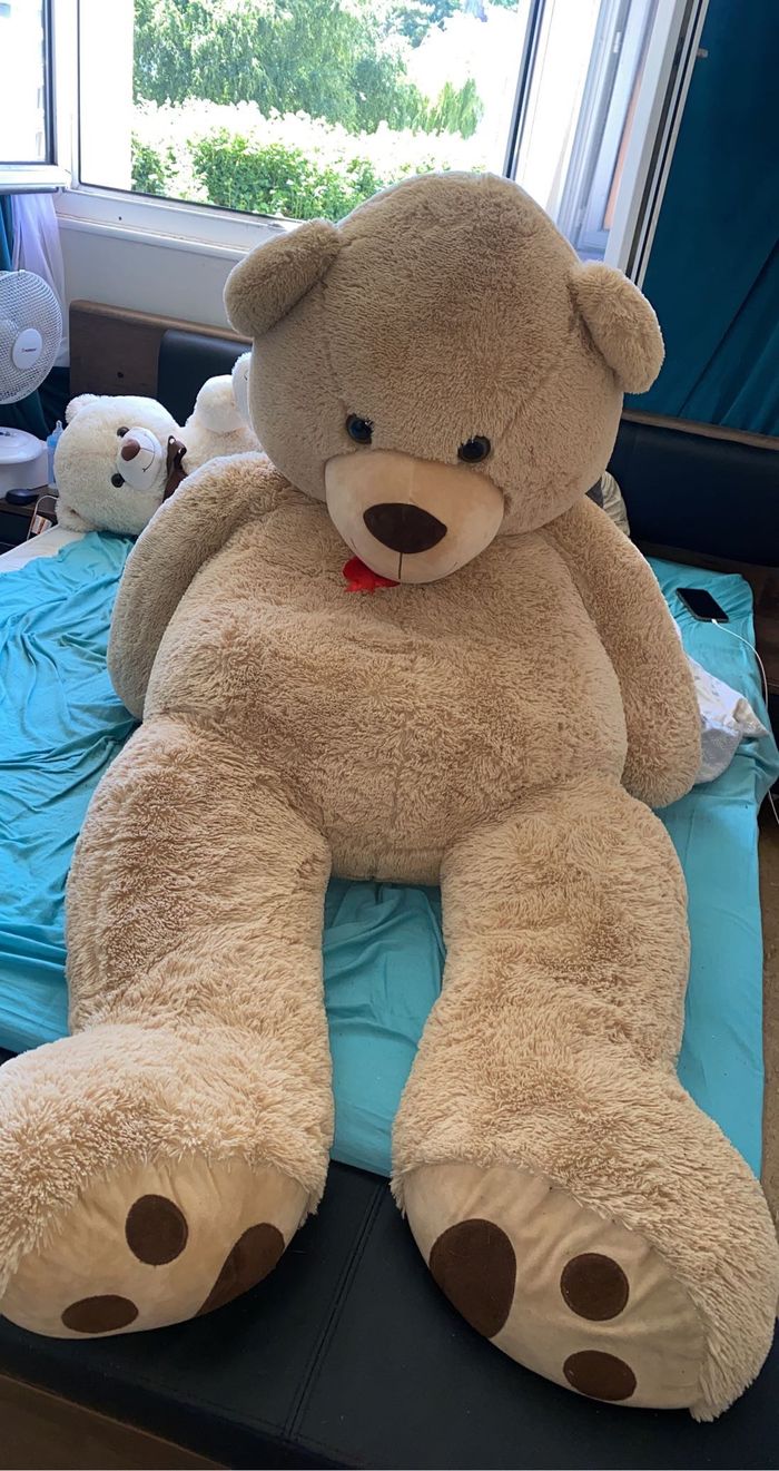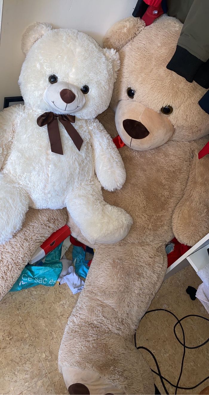 Bonjour. Je vend 2 ours en peluches et j’offre le 3 eme ( il n’est pas en photo ) 1 beige de presque 2m 1 blanc de 50 cm environ Celui offert est marron Prix globale 110. A pars un lion en peluche à vendre 10 euros Je peut aussi vendre à l’unité. Prix négociable dans la limite du raisonnable. Ours en peluches toujours bien entretenue