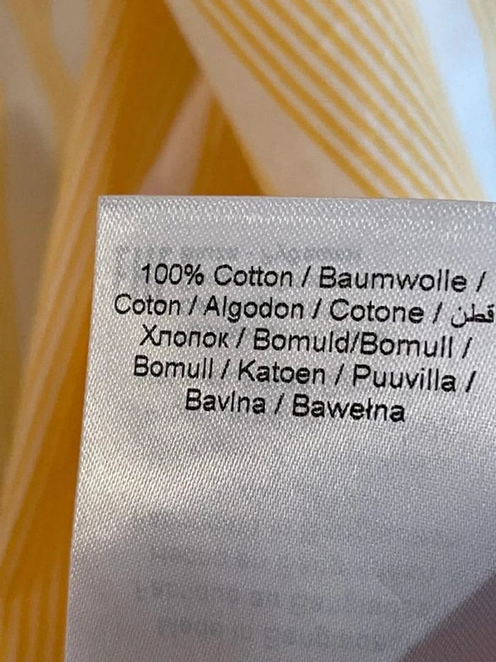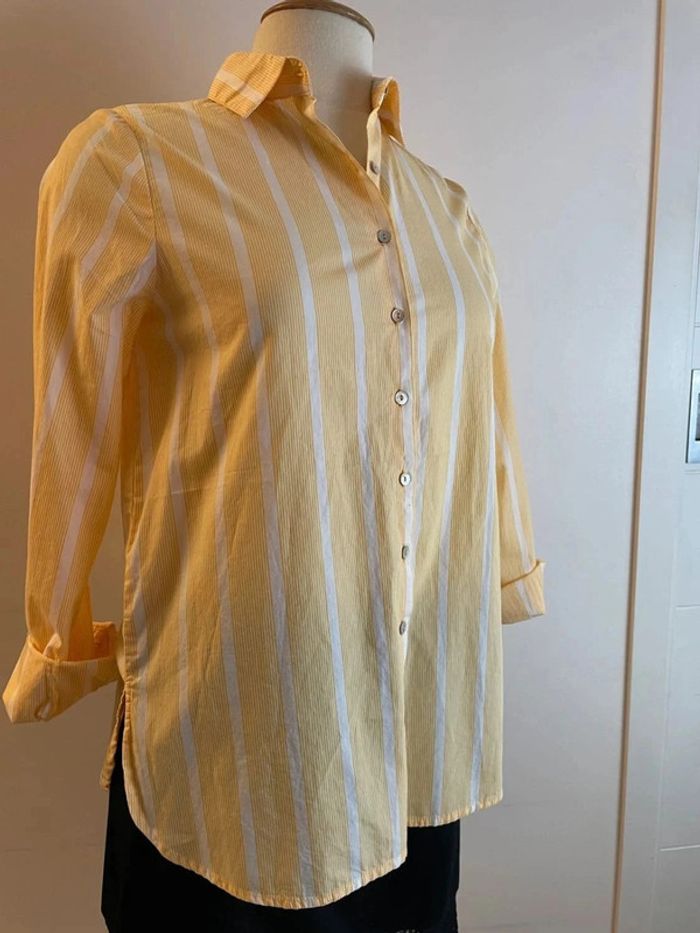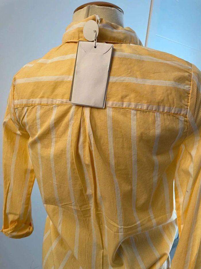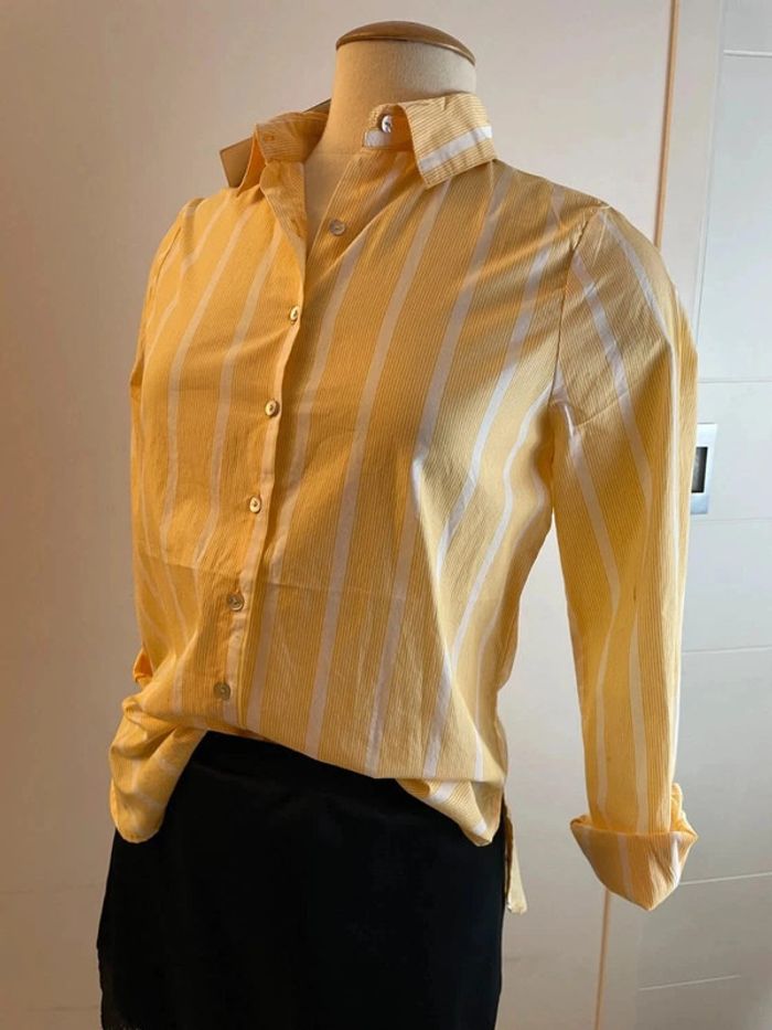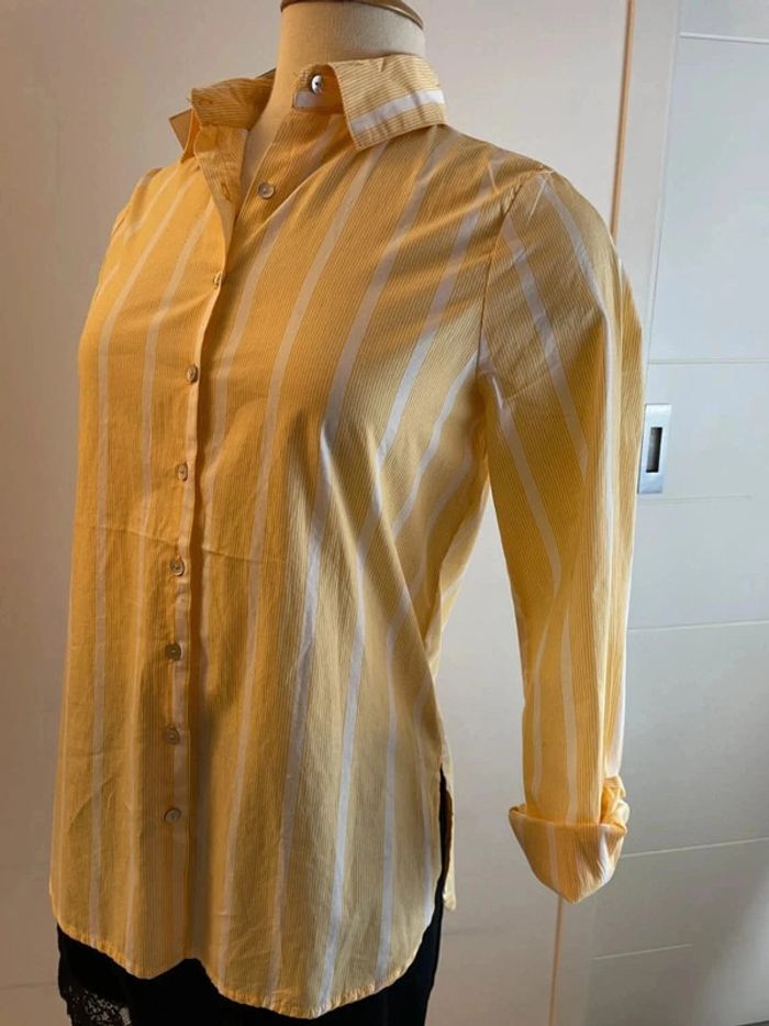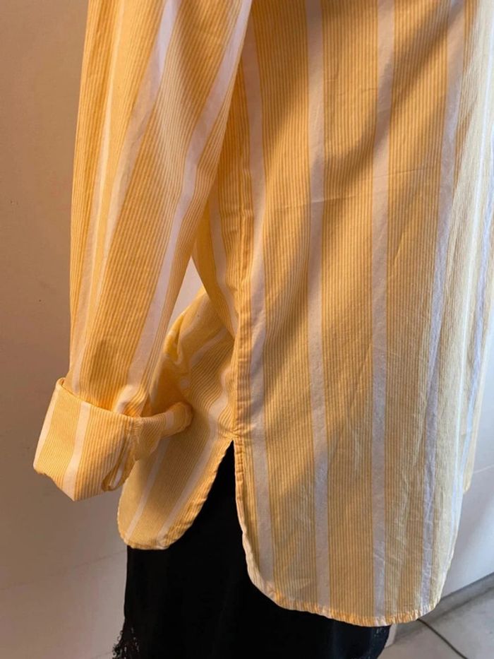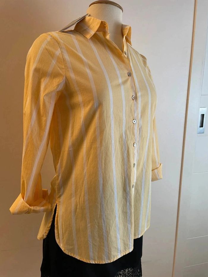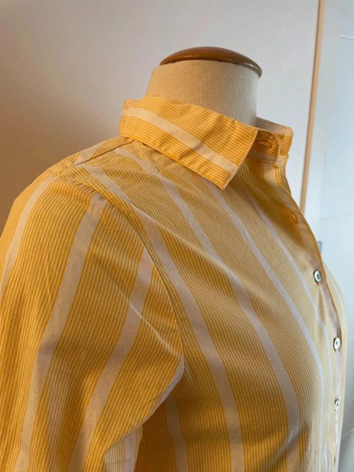 Superbe chemise rayée blanche et orange (orange clair qui tire vers le saumon). Sa coupe cintrée et sa belle longueur lui confèrent un style incroyable : pour être working girl ou bien sexy girl, elle sera parfaite.