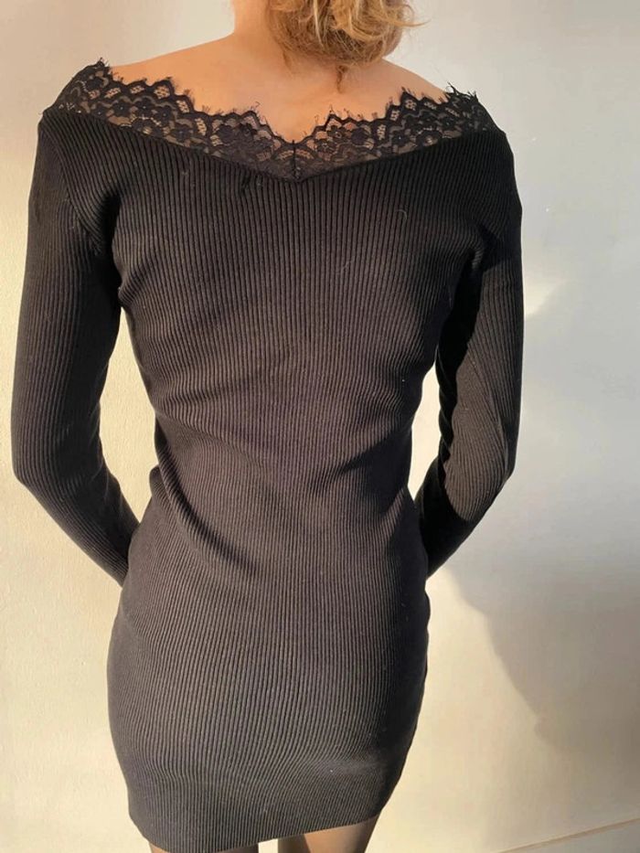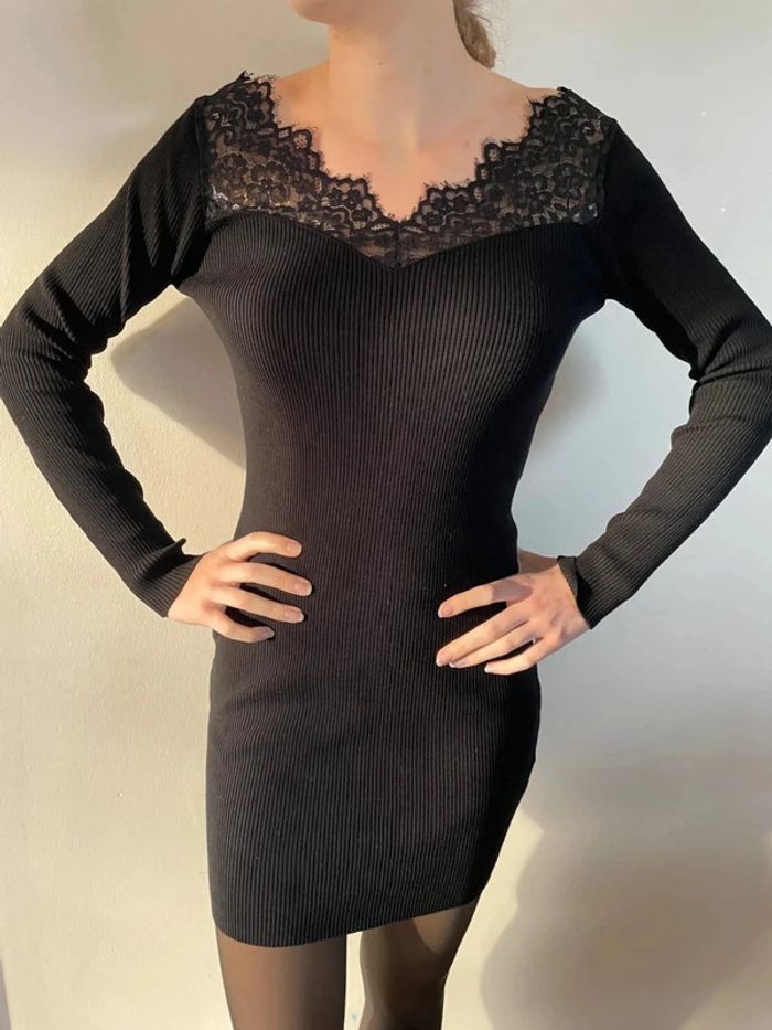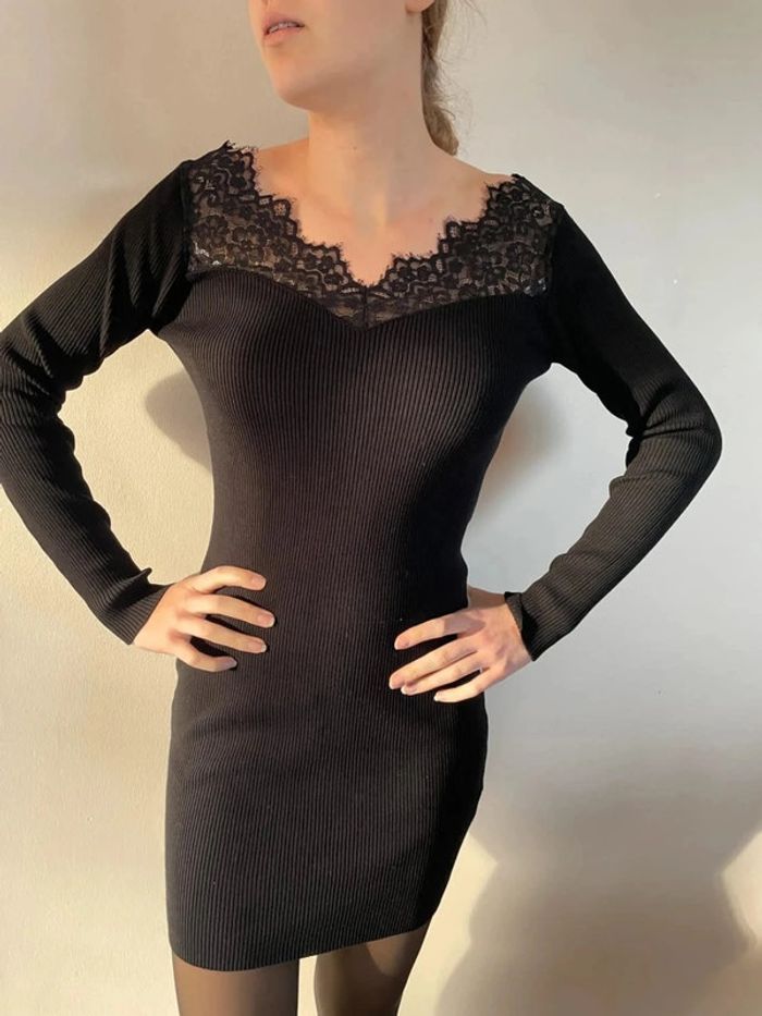 Robe pull noire col dentelle chaude et chic - photo numéro 1