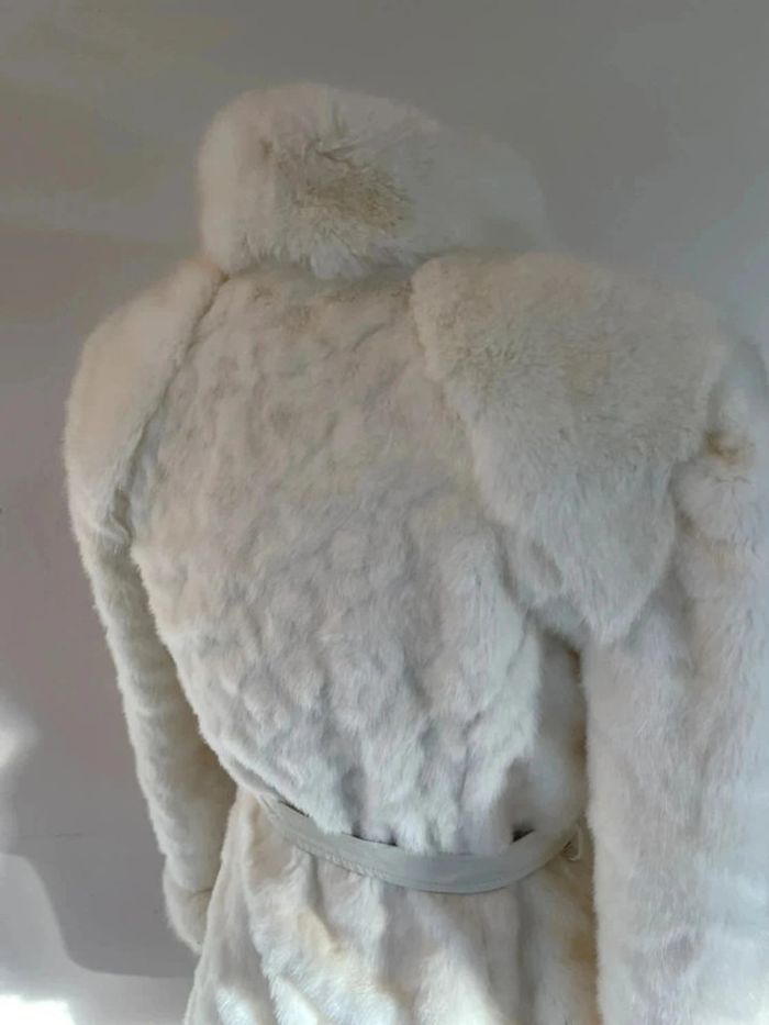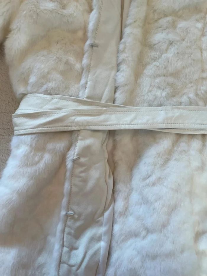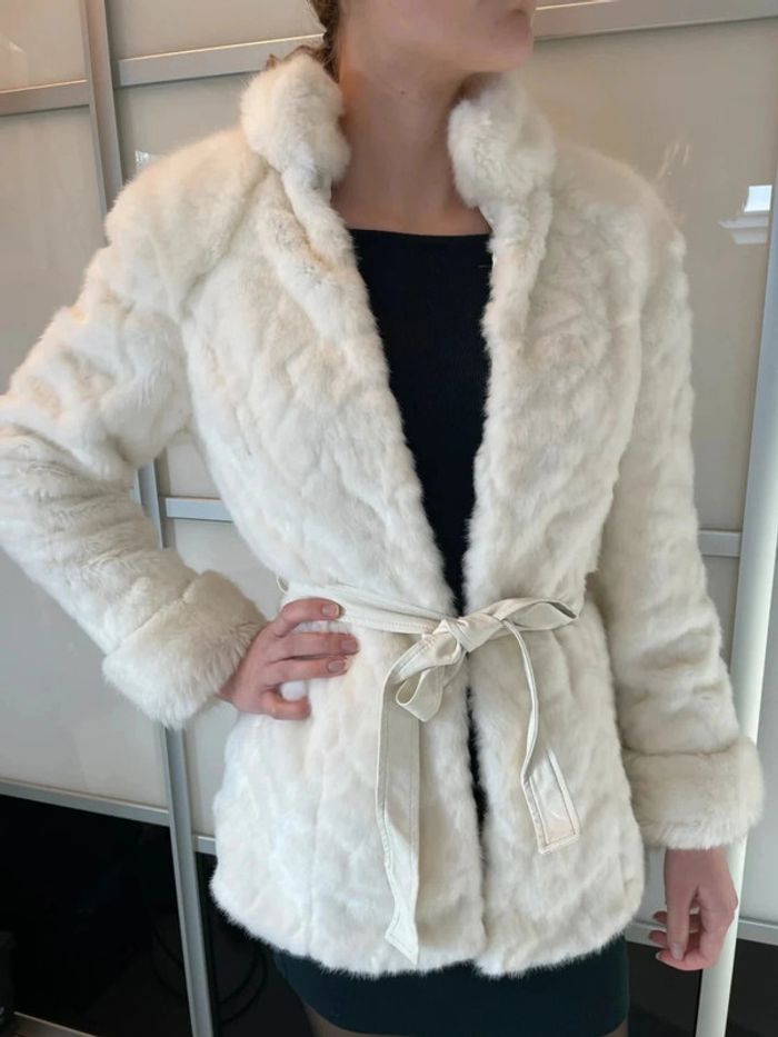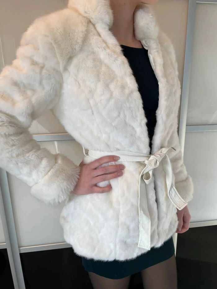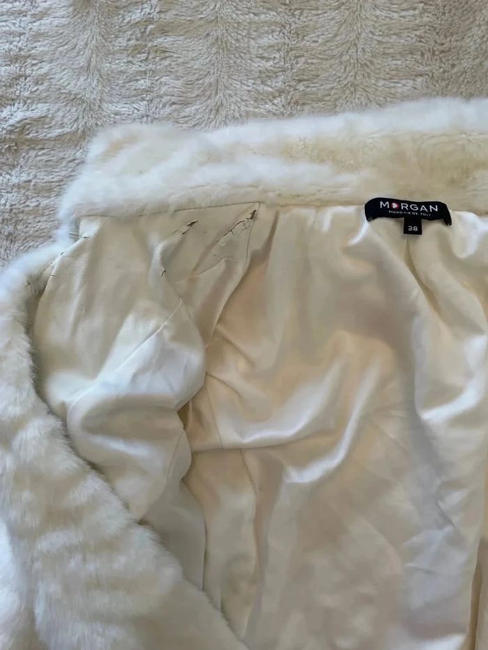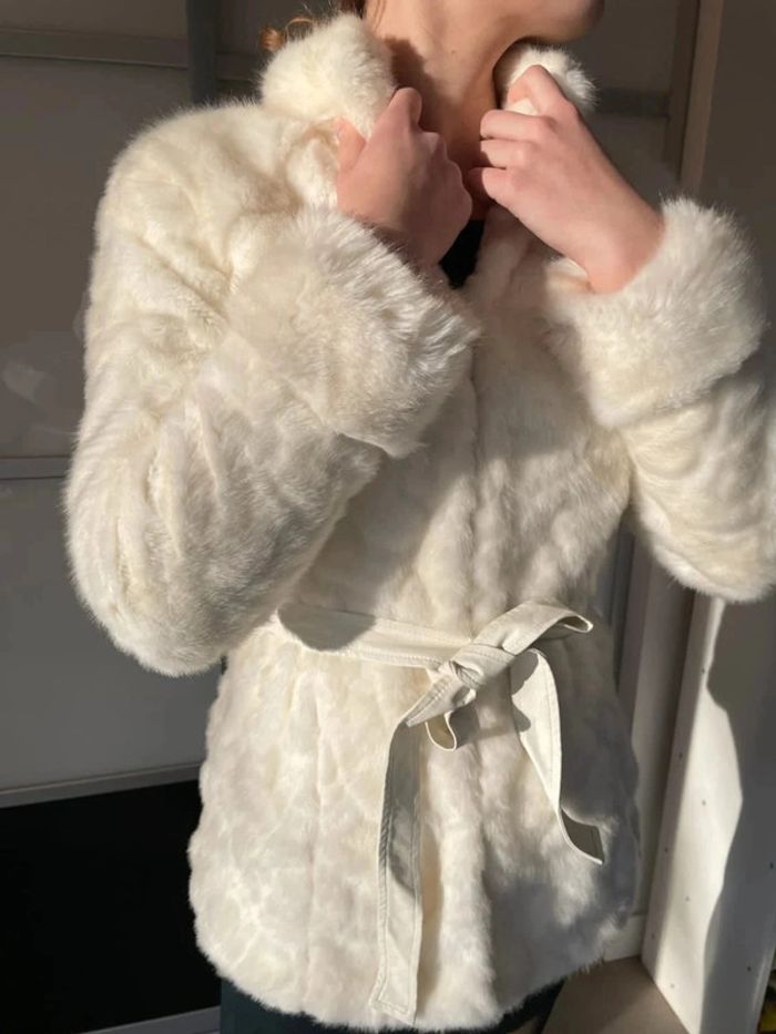 Sublime ✨ manteau façon fourrure de la marque Mango ! ✨ Il est d’un blanc crème somptueux et élégant, et sa ceinture simili cuir est géniale et pratique. Il se ferme par des crochets de haut en bas.